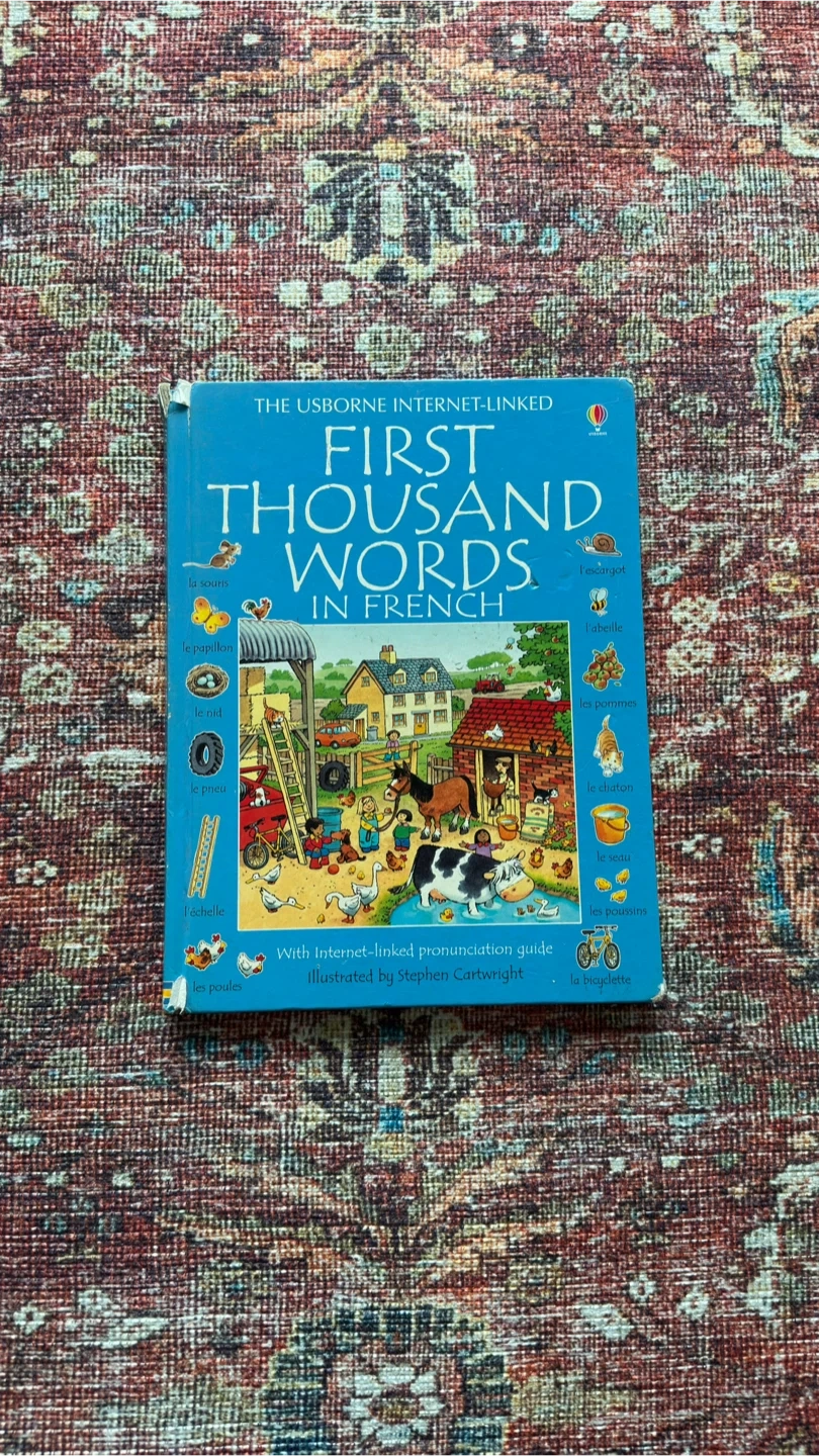 I'm giving away an Usborne book titled "First Thousand Words in French"! It's an internet-linked book with an illustrated pronunciation guide by Stephen Cartwright. Perfect for learning French vocabulary!