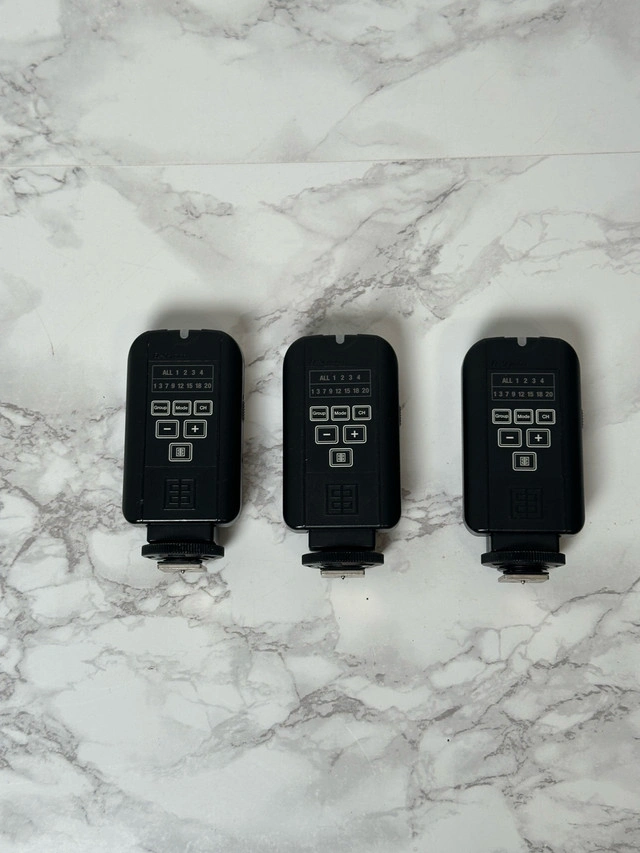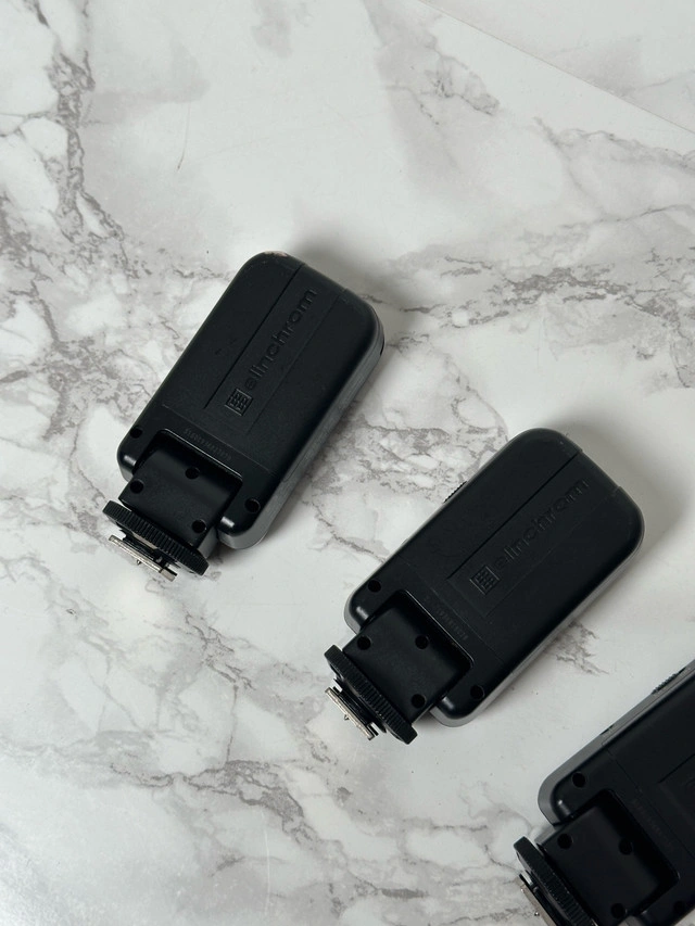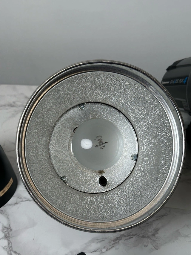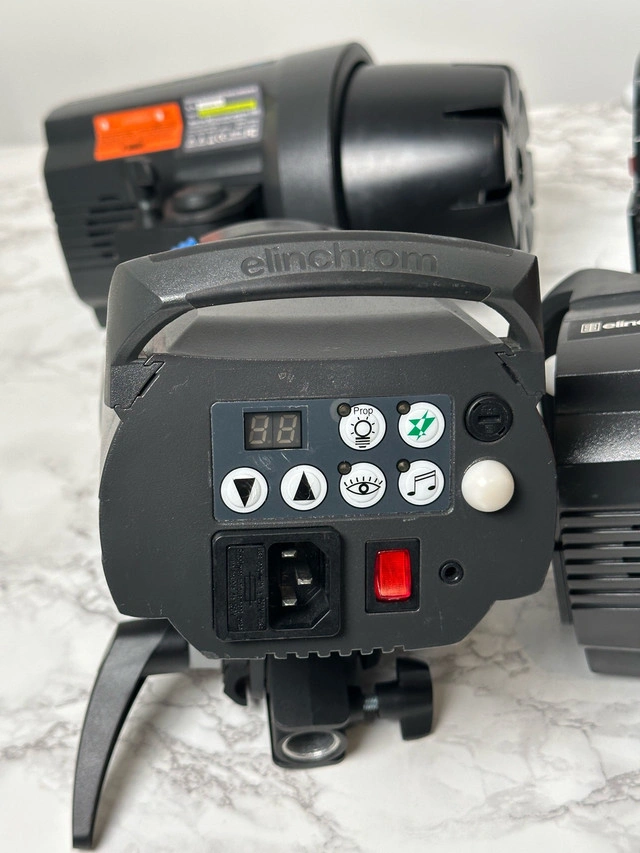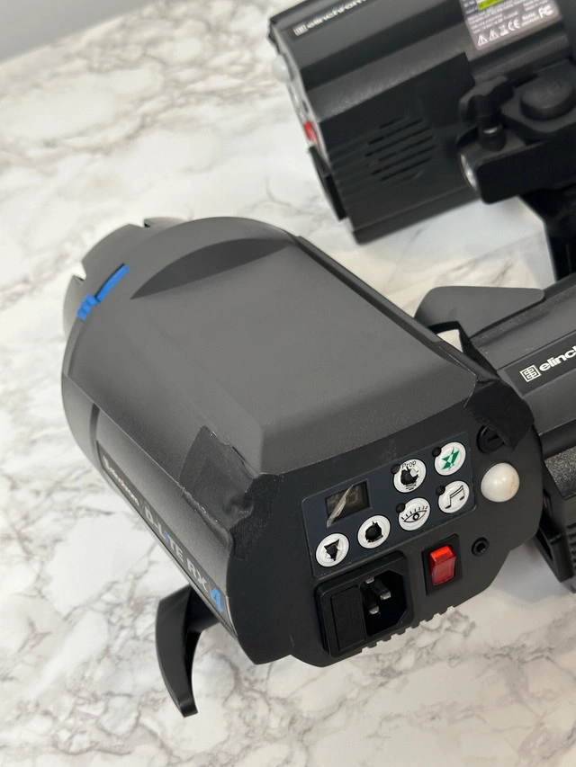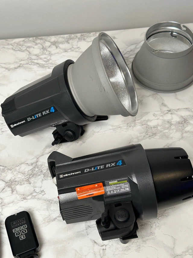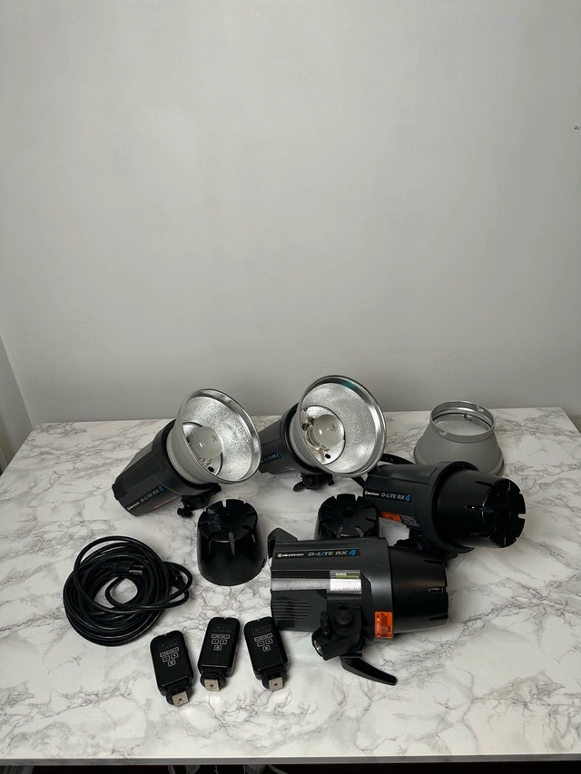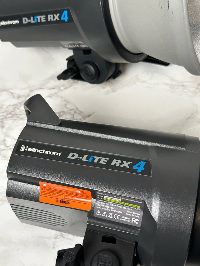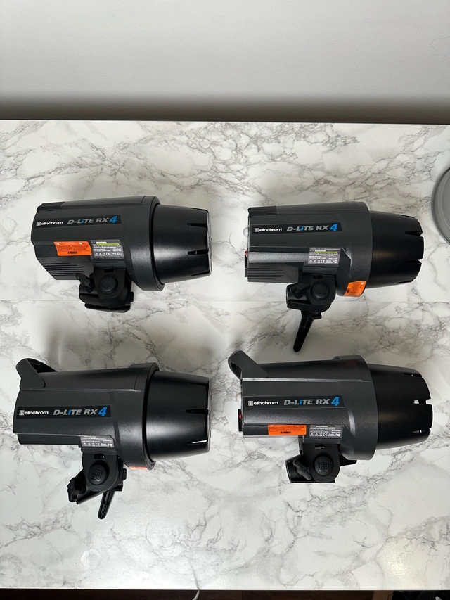 5Set of 4 Elinchrome d-lite rx 4 In working condition. scratches and damages as shown in photos & 2 of the strobe is missing the top handle Selling all as a set. Includes: 4 x Elinchrome d-lite rx 4 - photo strobe 3 x elinchrome triggers 4x power cables 4x strobe collar Cash only