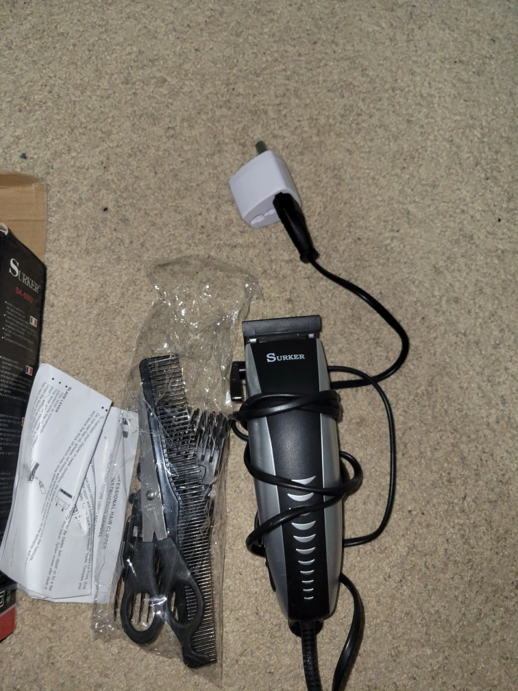 Selling a Surker rechargeable hair clipper, model SK-5602. It comes with the box and includes the comb, scissors, oil, and brush. Perfect for professional hair clipping at home!