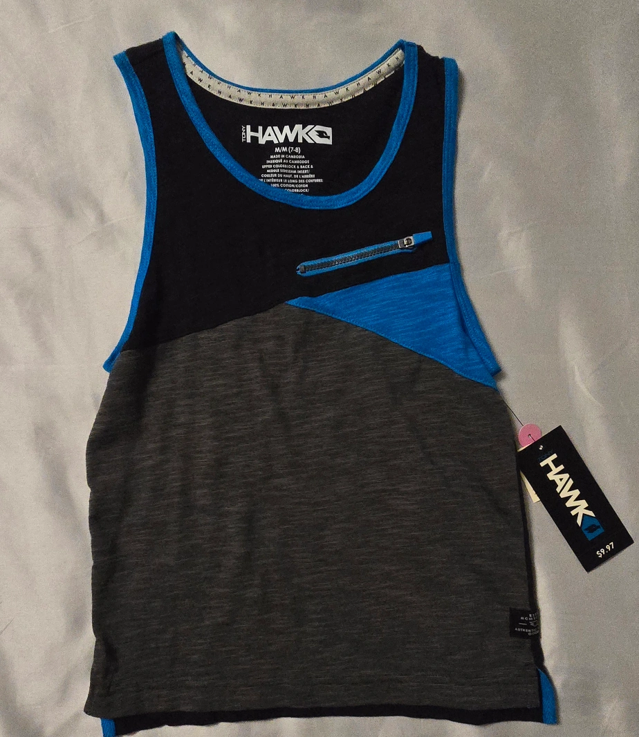 This Tony Hawk tank top is in NEW condition with the original tag still attached! It's a size M (7-8) and features a cool colourblock design in black, grey, and blue. Originally $9.97 Please check our listings for more great items for the whole family! LOTS of LIKE NEW items in EXCELLENT condition and BRAND NEW items with tags! ALL for VERY good prices!!! 🙂