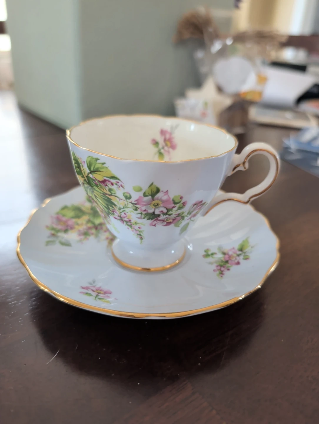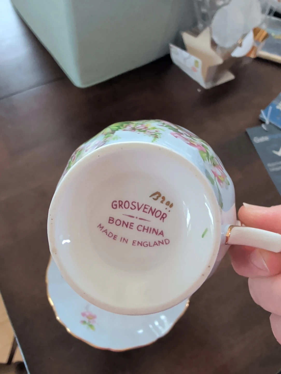 Lovely floral patterned teacup and saucer from Grosvenor. Made in England with delicate gold trim. It's bone china, offering a refined feel for your tea time.