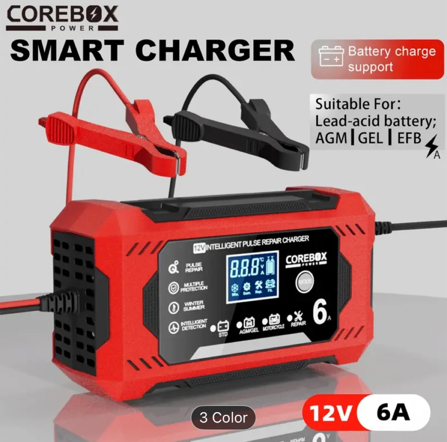 This COREBŌX smart charger supports battery charging for lead-acid, AGM, GEL, and EFB batteries. It's suitable for motorcycles, cars, off-road vehicles, SUVs, and more! It features multiple protections and intelligent detection for winter and summer use. The extended power cord is 150cm/59.06inch.