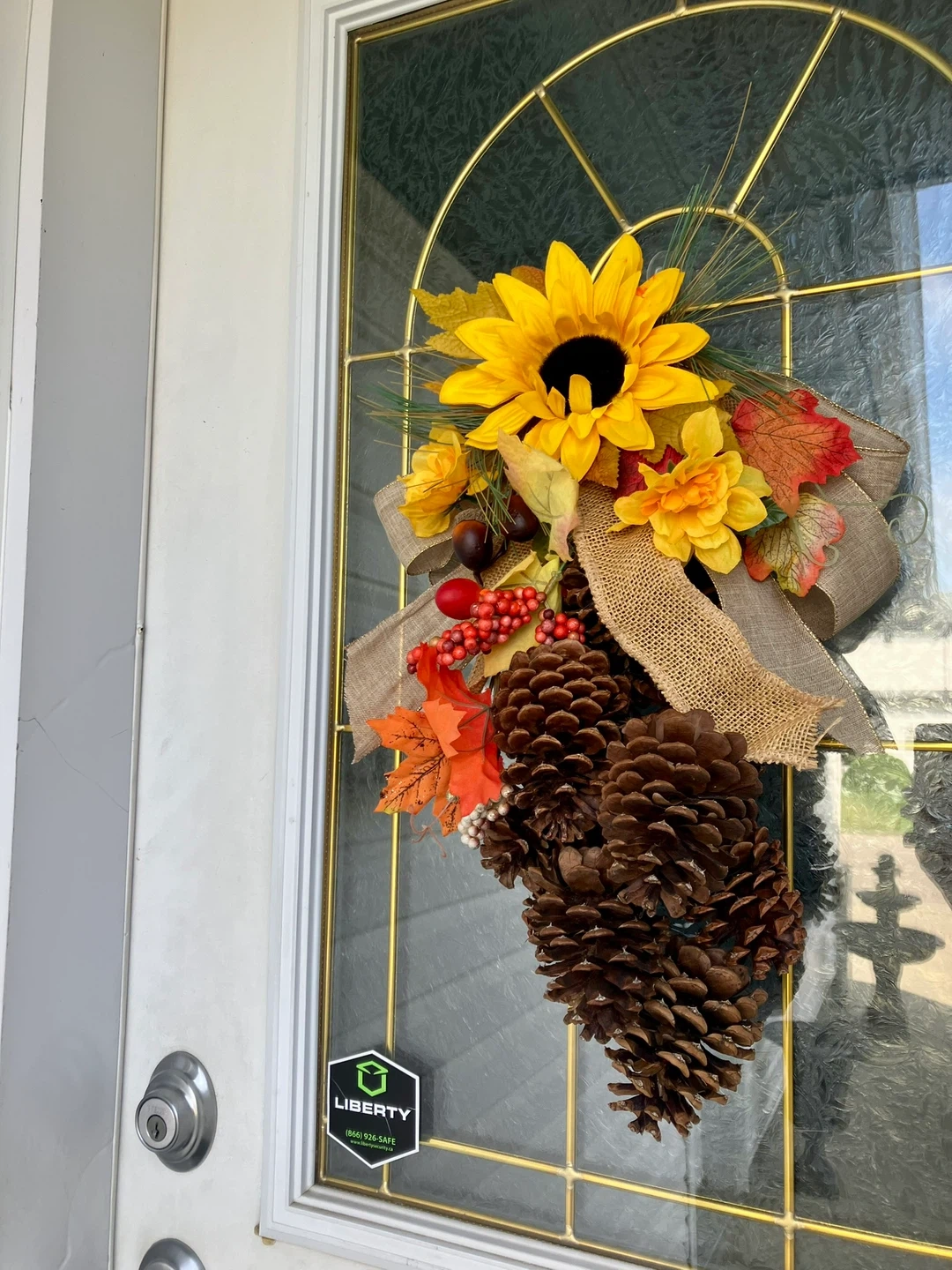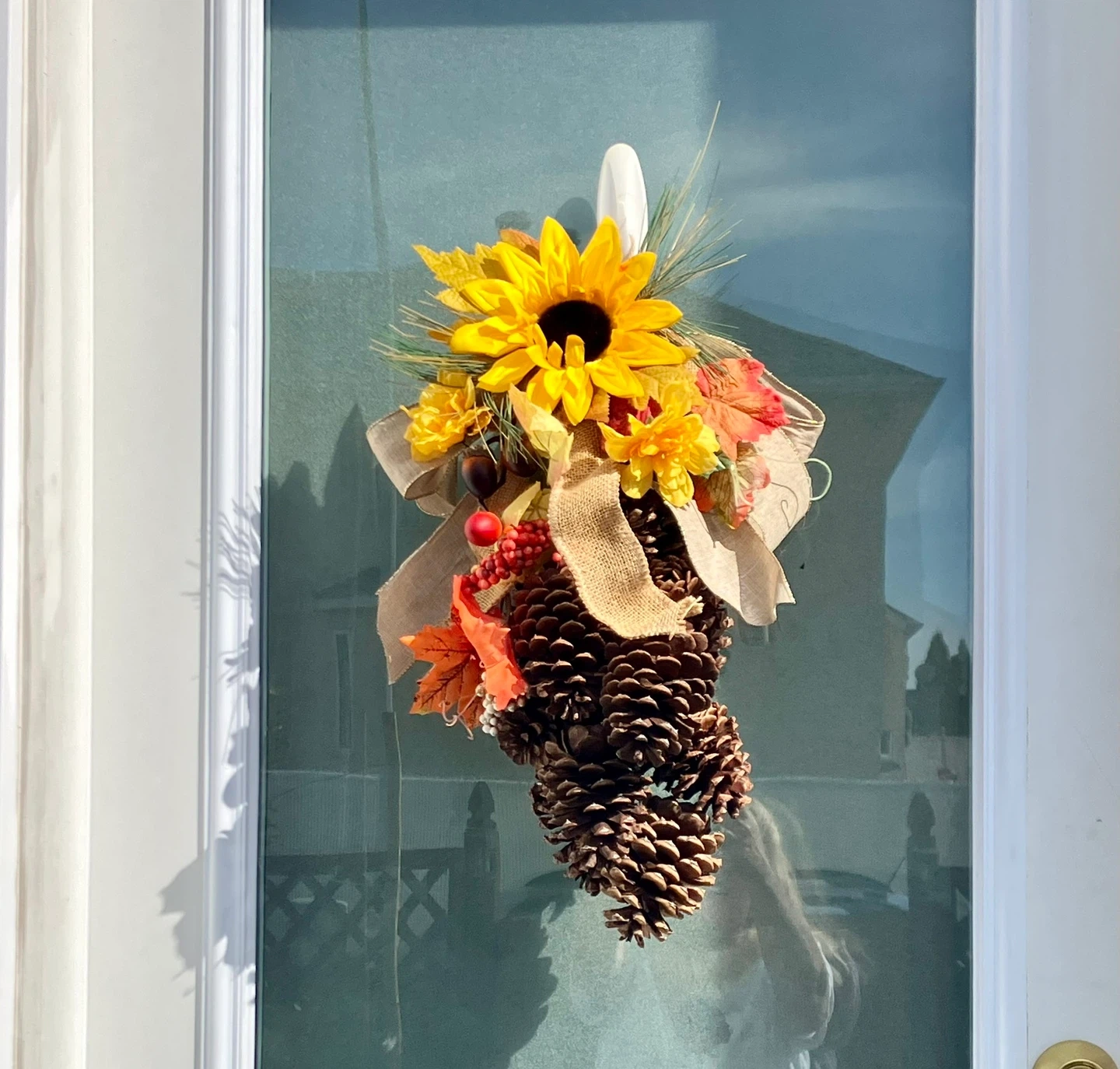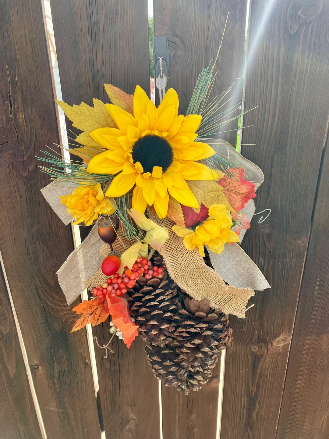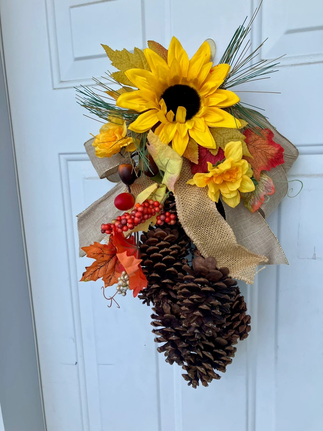 Spruce up your door with this charming pinecone and sunflower door hanger! It's got a rustic burlap bow and some cute fall leaves and berries mixed in. Perfect for adding a touch of autumn to your entryway