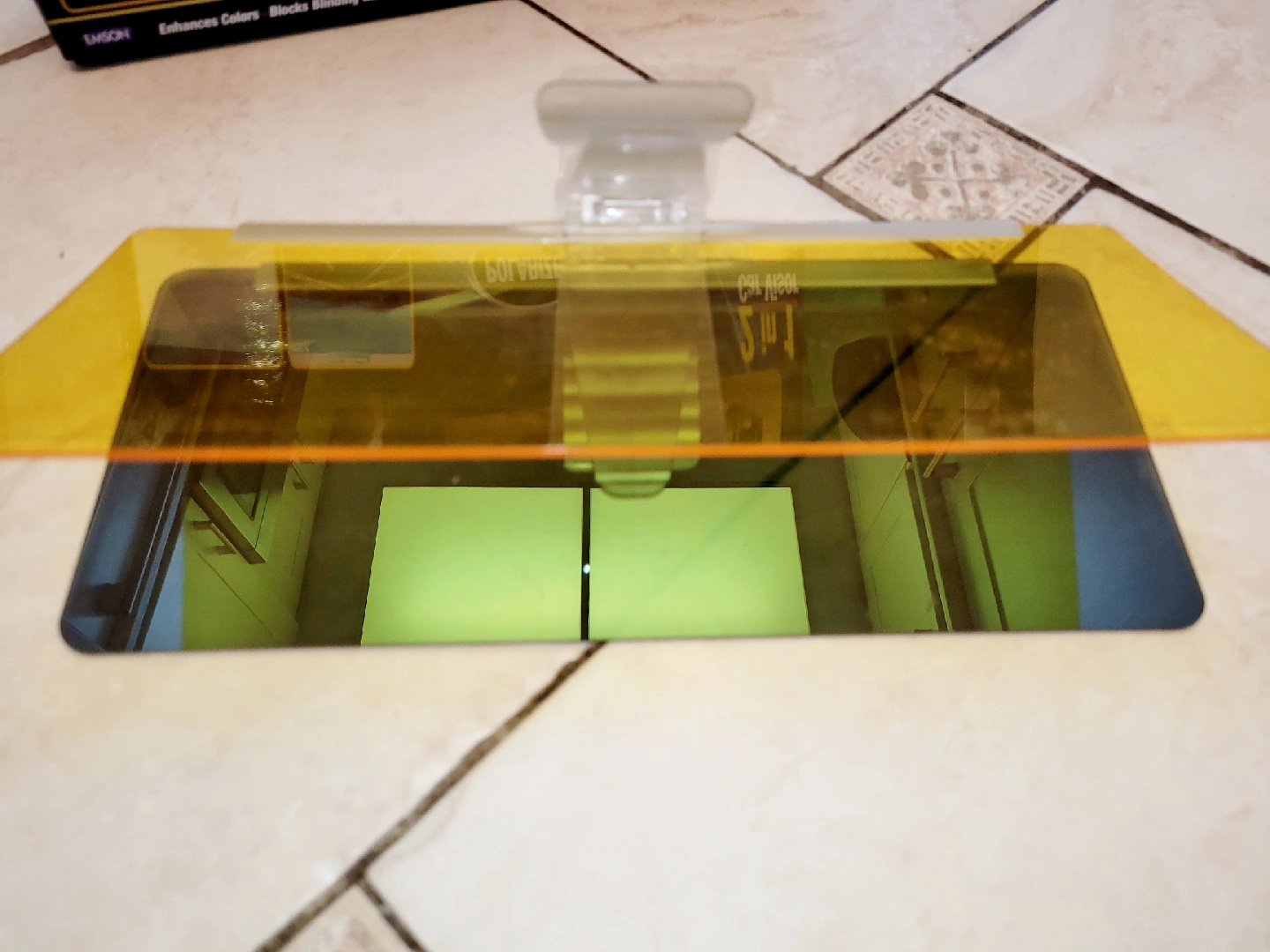 I'm selling a Bell+Howell Tac Visor, a 2-in-1 day & night car visor! It helps you see clearly without the glare. It's polarized and enhances colours, blocks blinding glare, and improves optical clarity. It uses light filtering technology for day time and night time driving.