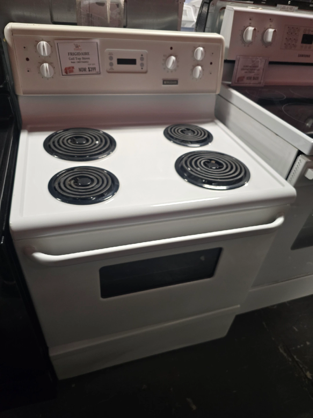 Selling a Frigidaire coil top stove in white. The sticker on the stove indicates it was on sale for $399.
