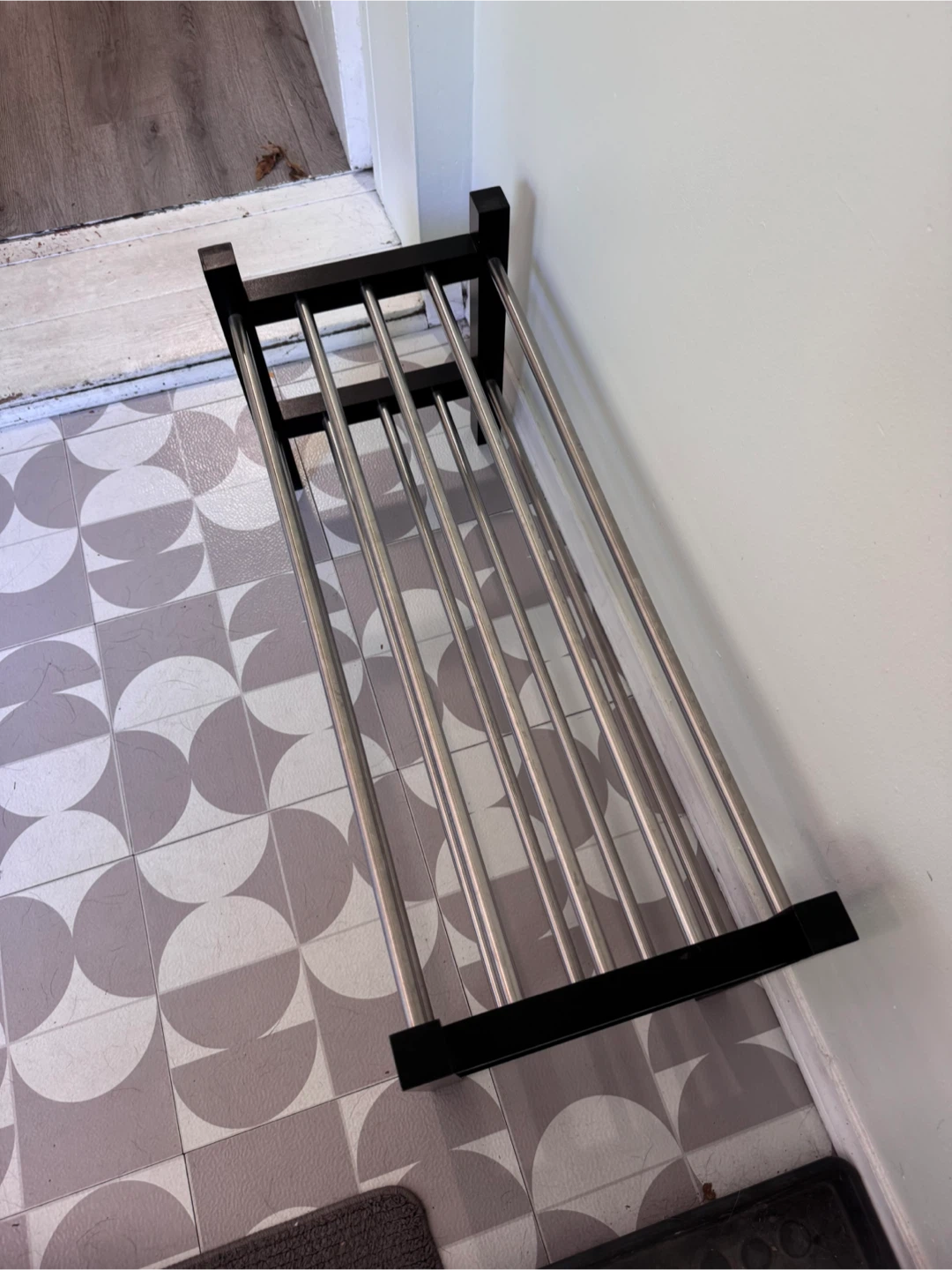Selling a shoe rack with a black frame and silver bars. It's in great shape and ready to organize your entryway or closet! Pickup near Queen E & Coxwell.