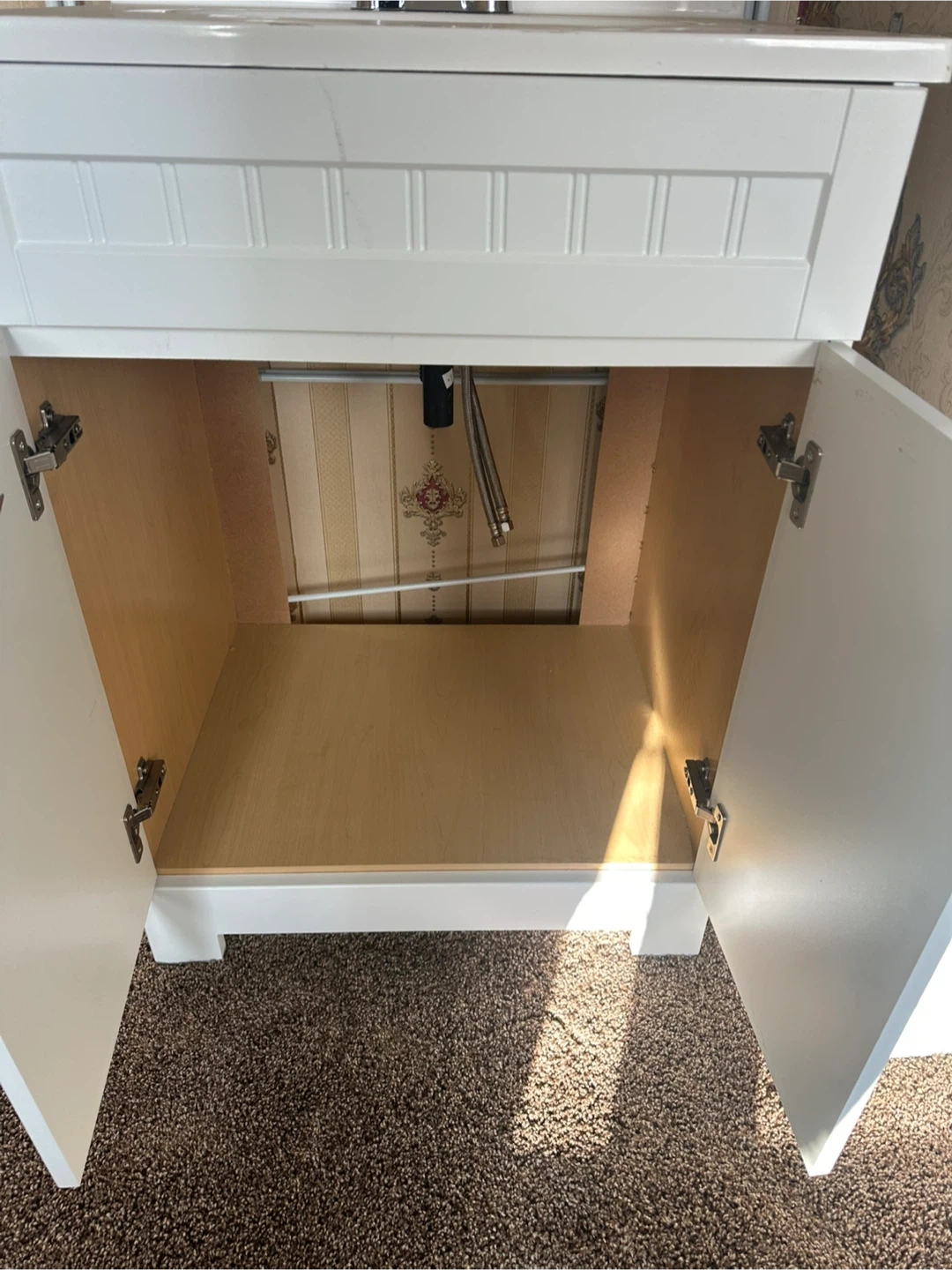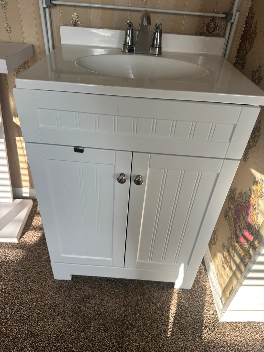 Selling a bathroom vanity with a sink. It's white and in good condition. Perfect for a small bathroom or powder room! The cabinet provides storage space underneath the sink