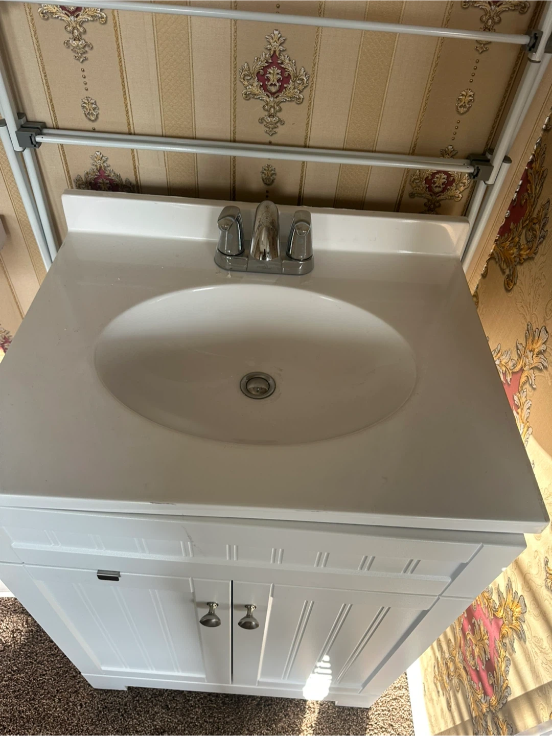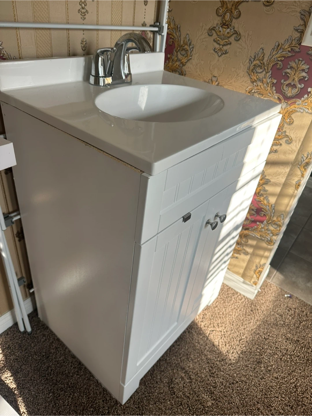 Selling a bathroom vanity with a sink. It's white and in good condition. Perfect for a small bathroom or powder room! The cabinet provides storage space underneath the sink