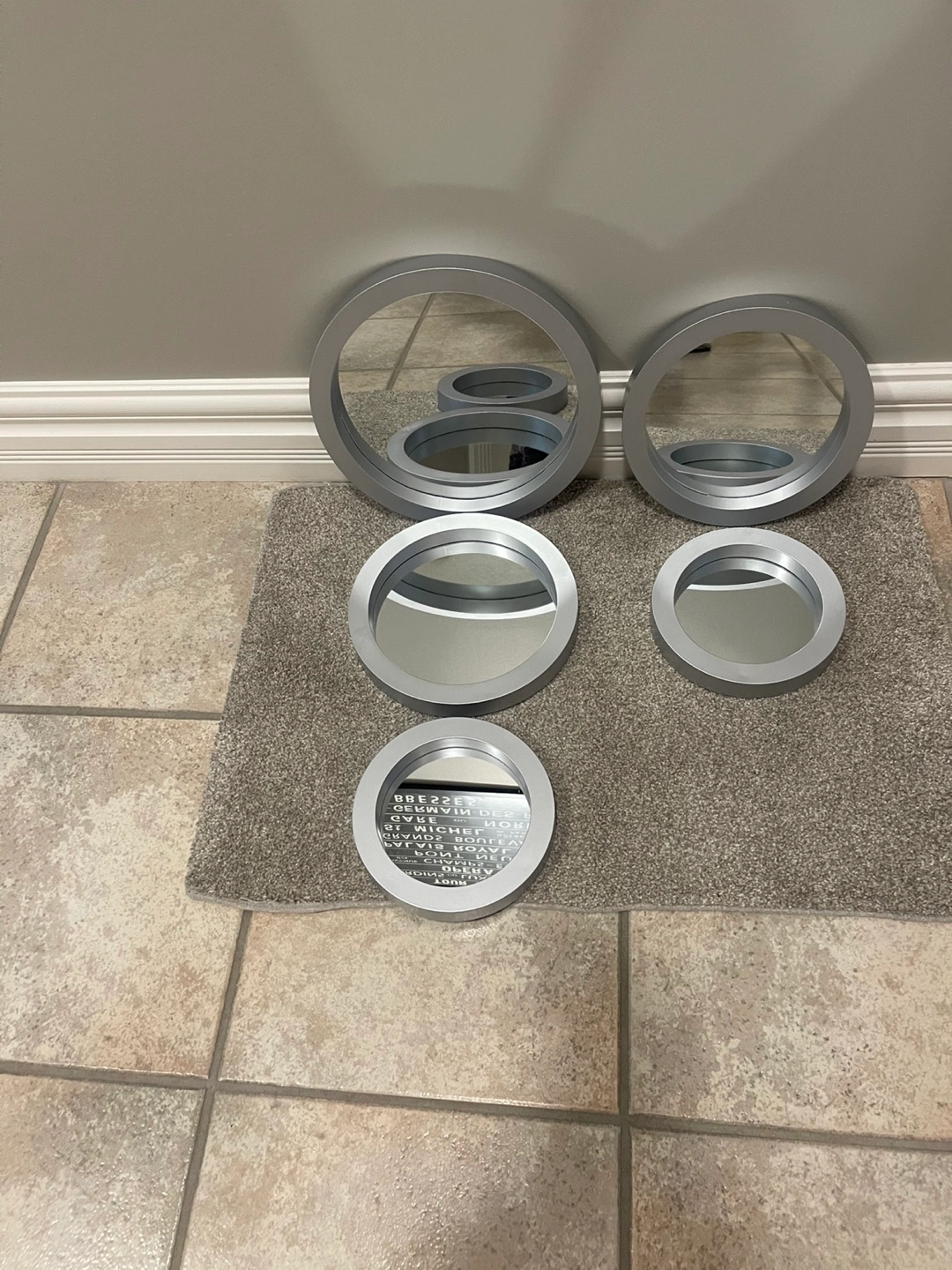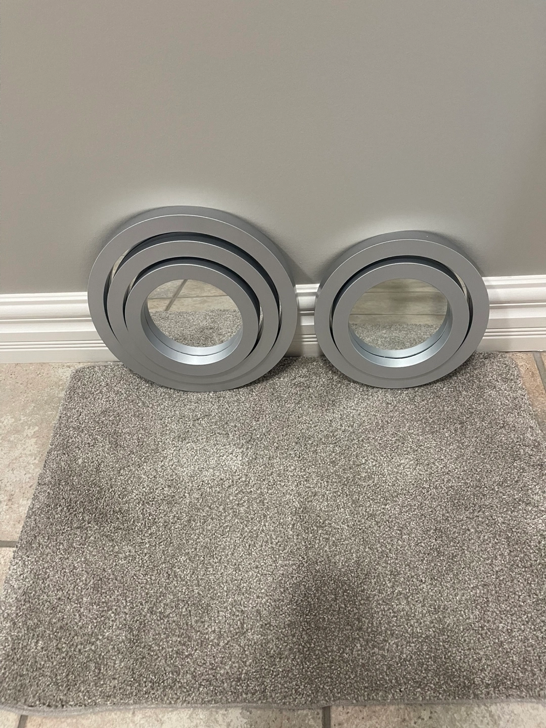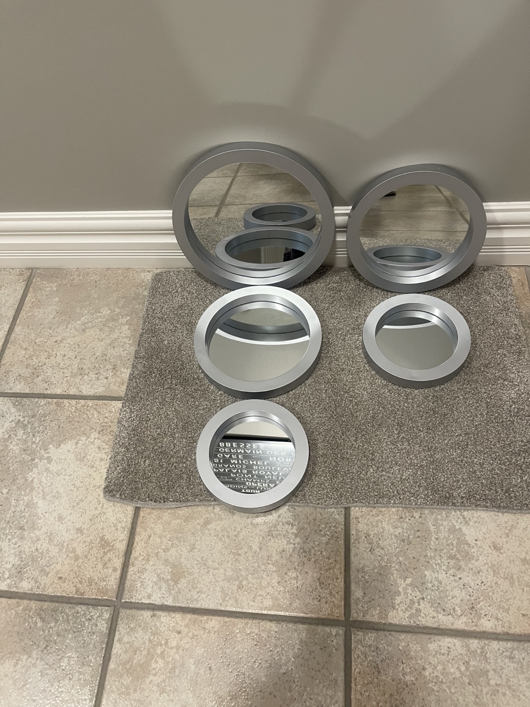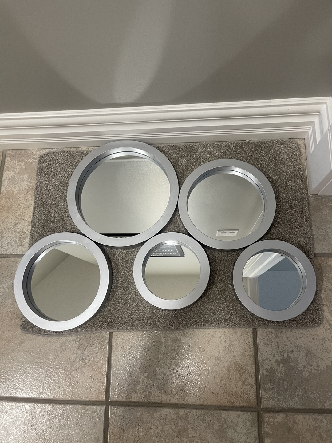 JUST REDUCED AGAIN!!! NOW ONLY 20.00! Selling a set of five round brand new mirrors with silver frames. They come in various sizes, perfect for adding a modern touch to any room! They have never been used and ready to find a new home. Small is 7” or 18 cm - Medium is 9” or 23 cm - Large is 28 cm or 11”.