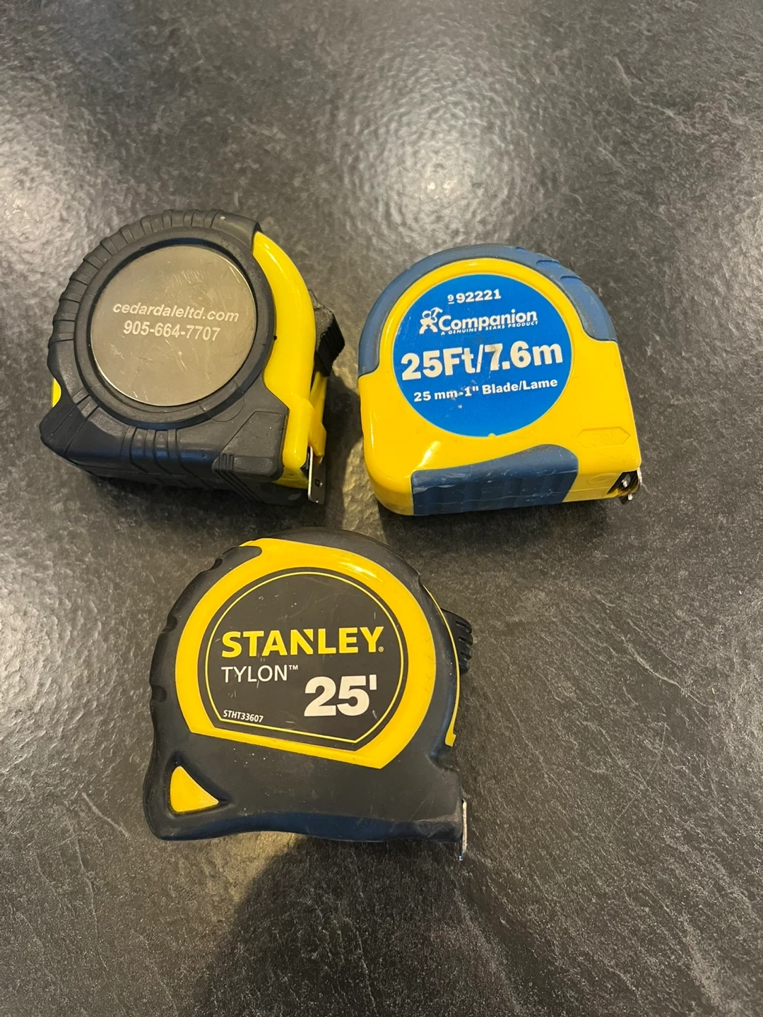 Selling a Stanley Tylon 25' tape measure, along with a Companion 25ft/7.6m tape measure and a cedardaleltd.com tape measure!