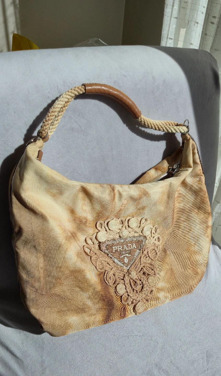 This is a Prada hobo bag with a unique Embroidery design. It features a rope handle and leather detailing. The bag is perfect for everyday use and is in great condition!