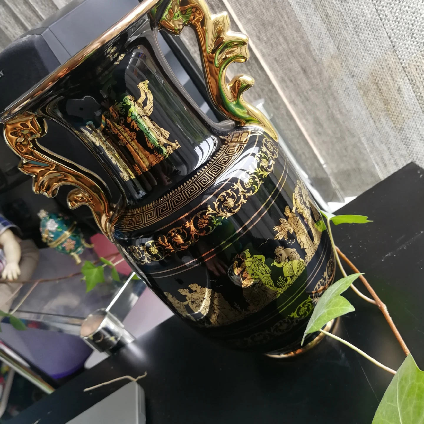 Beautiful black vase with gold detailing. It has a unique design with figures and patterns, perfect for adding a touch of elegance to any room!