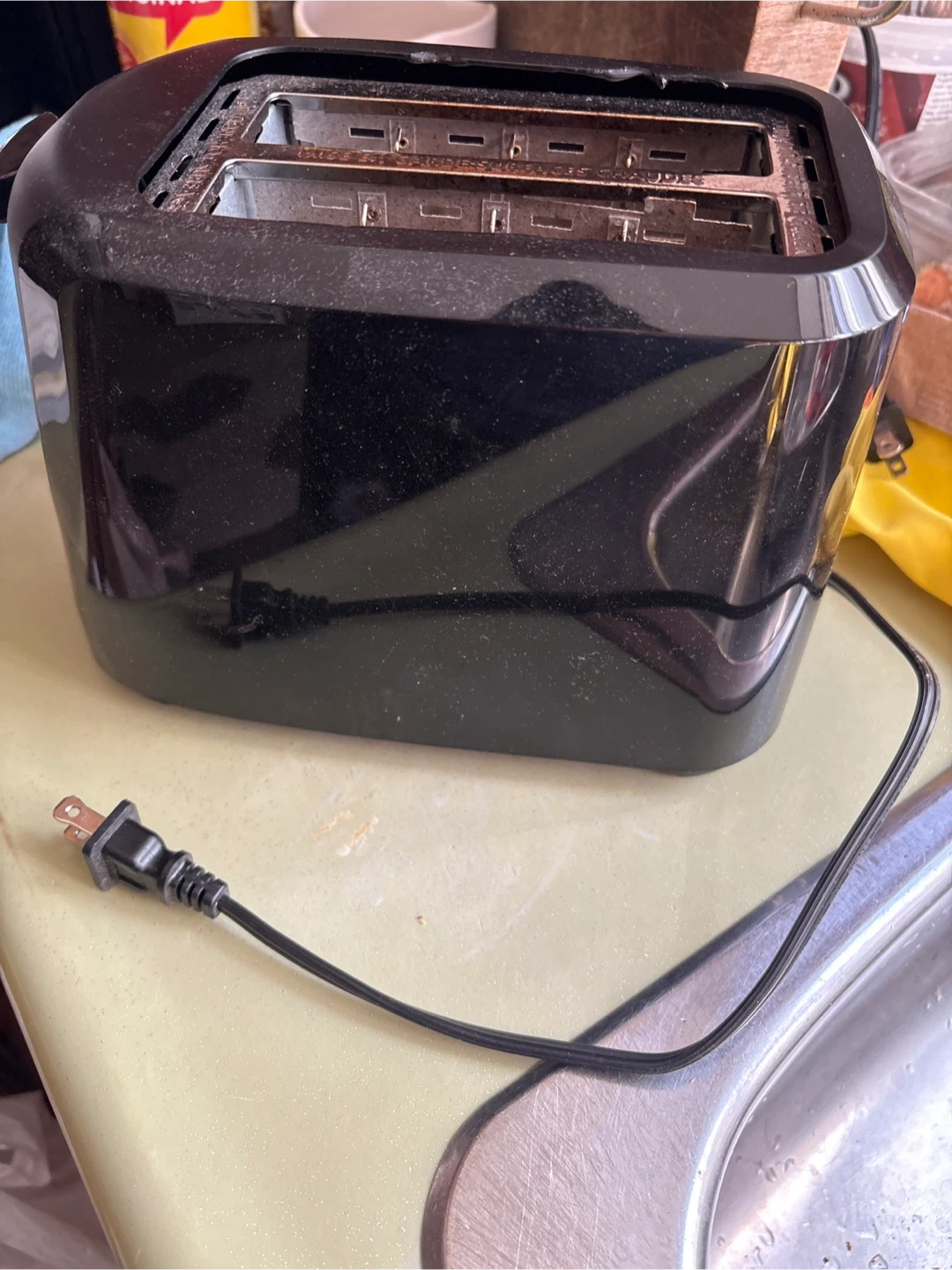 Selling a used black toaster. It's in fair condition and works well. It has settings from 1-5 for toasting preferences. Please see photos for condition