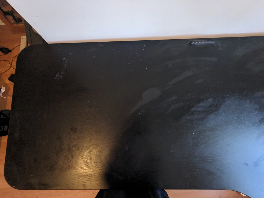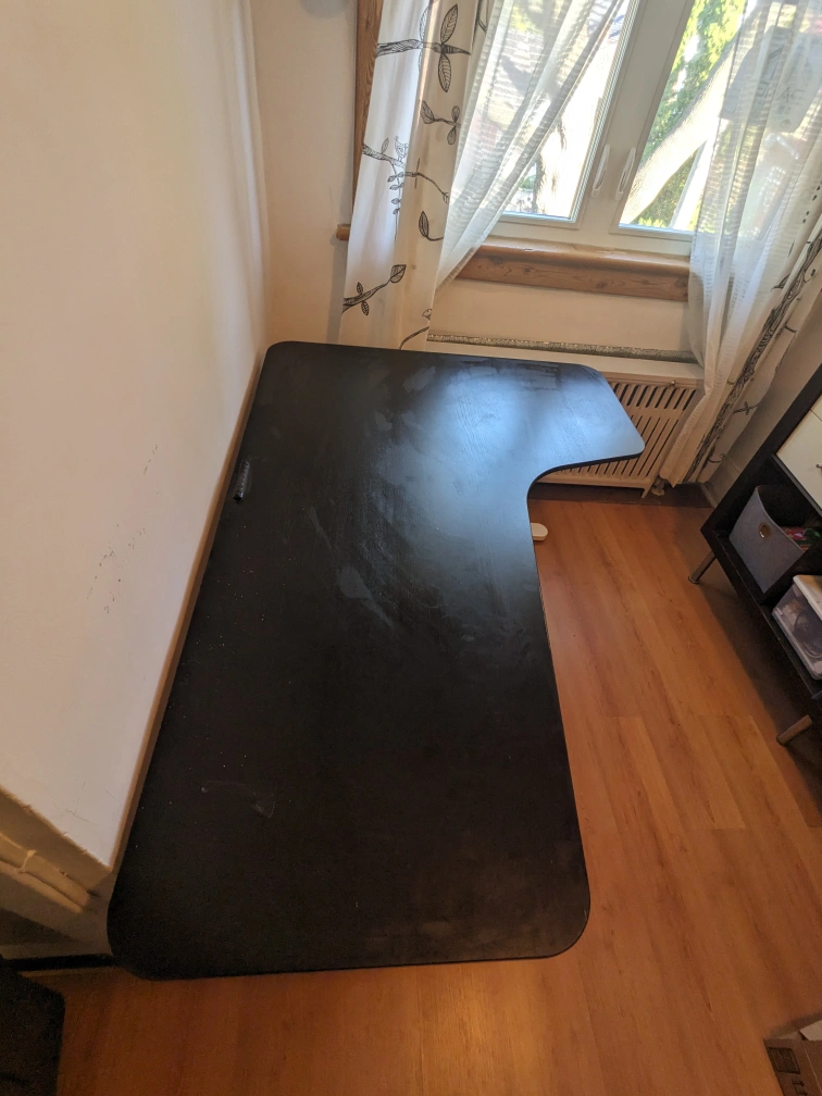 Ikea BEKANT desk (L-shaped) with right hand corner. The desk can be covered to standing (non-electric, height is adjustable). Its in good condition, but there are some slight scuffs and white paint drops (see last photo). There is a mesh hanger for cable management/storage under the desk. https://www.ikea.com/ca/en/p/bekant-corner-desk-right-black-stained-ash-veneer-white-s99282901/#content