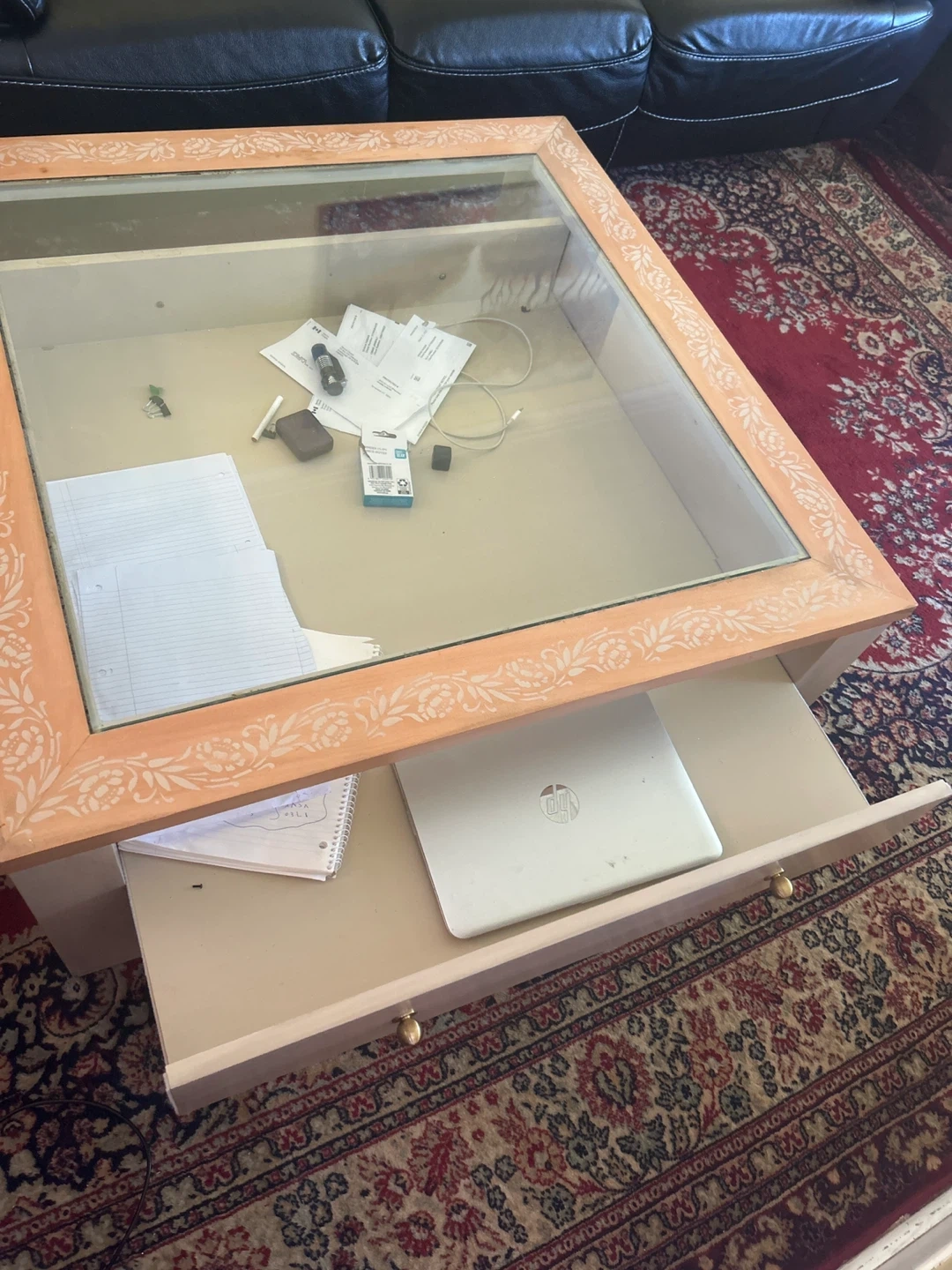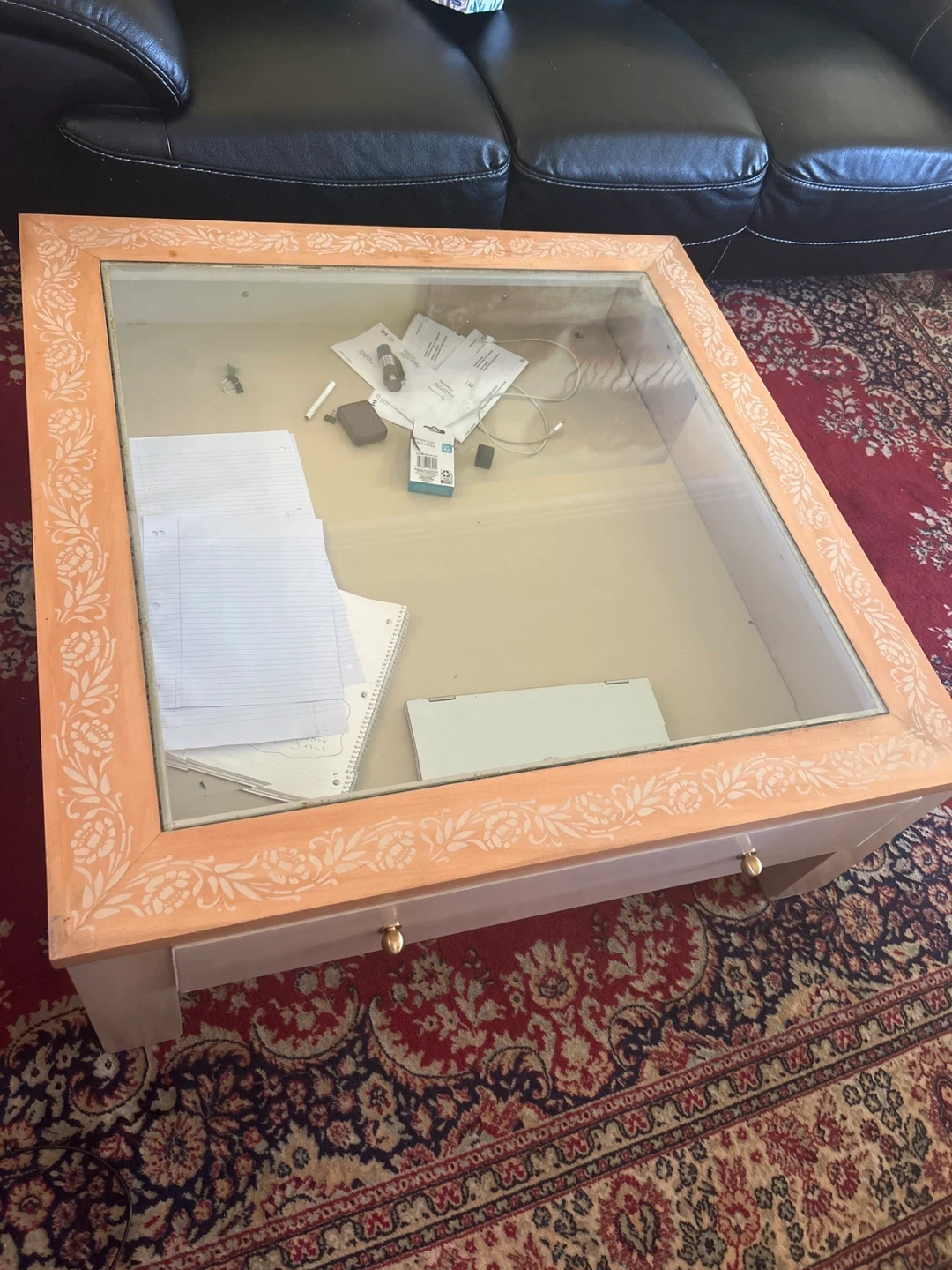 Selling a coffee table with a glass top. It has a unique floral design around the wooden frame and a drawer for storage. It would be a great addition to any living room