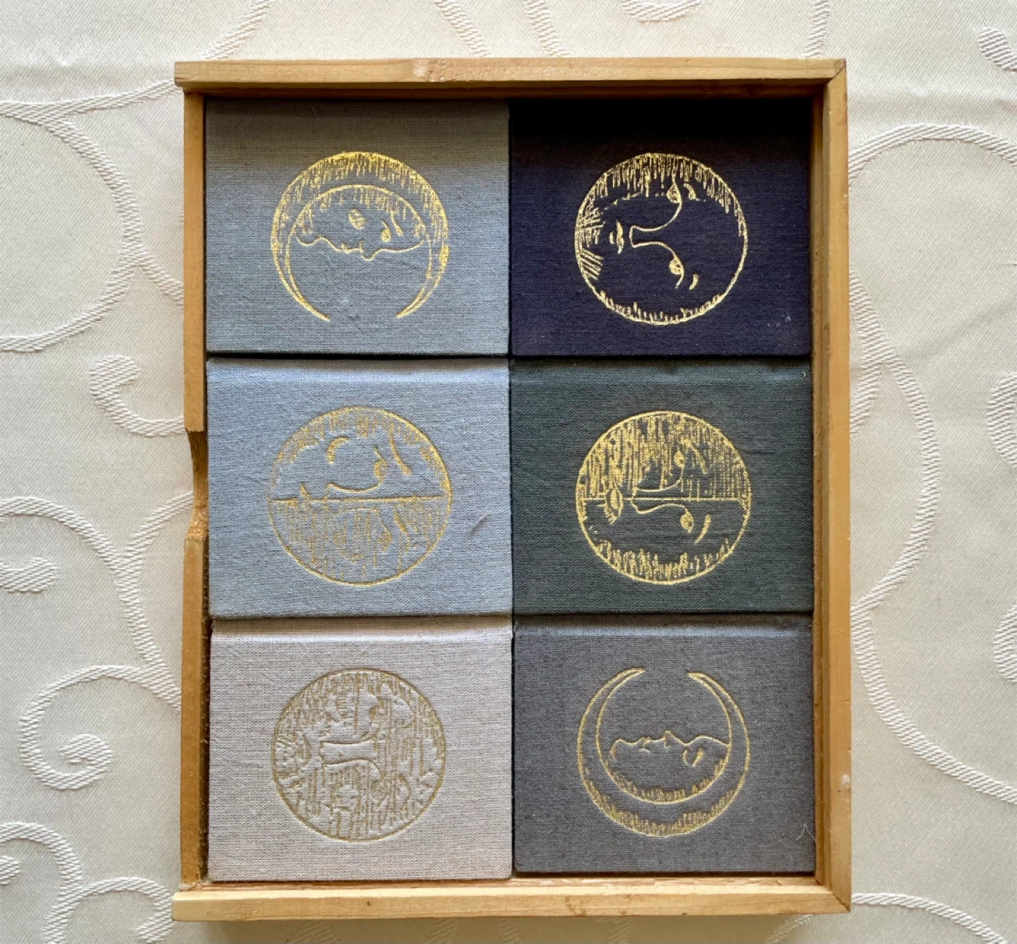 Selling a set of six mini journals, each representing a different phase of the moon. They come in a wooden box, making them a lovely gift or a unique addition to your stationery collection! The journals have different coloured covers with gold detailing.