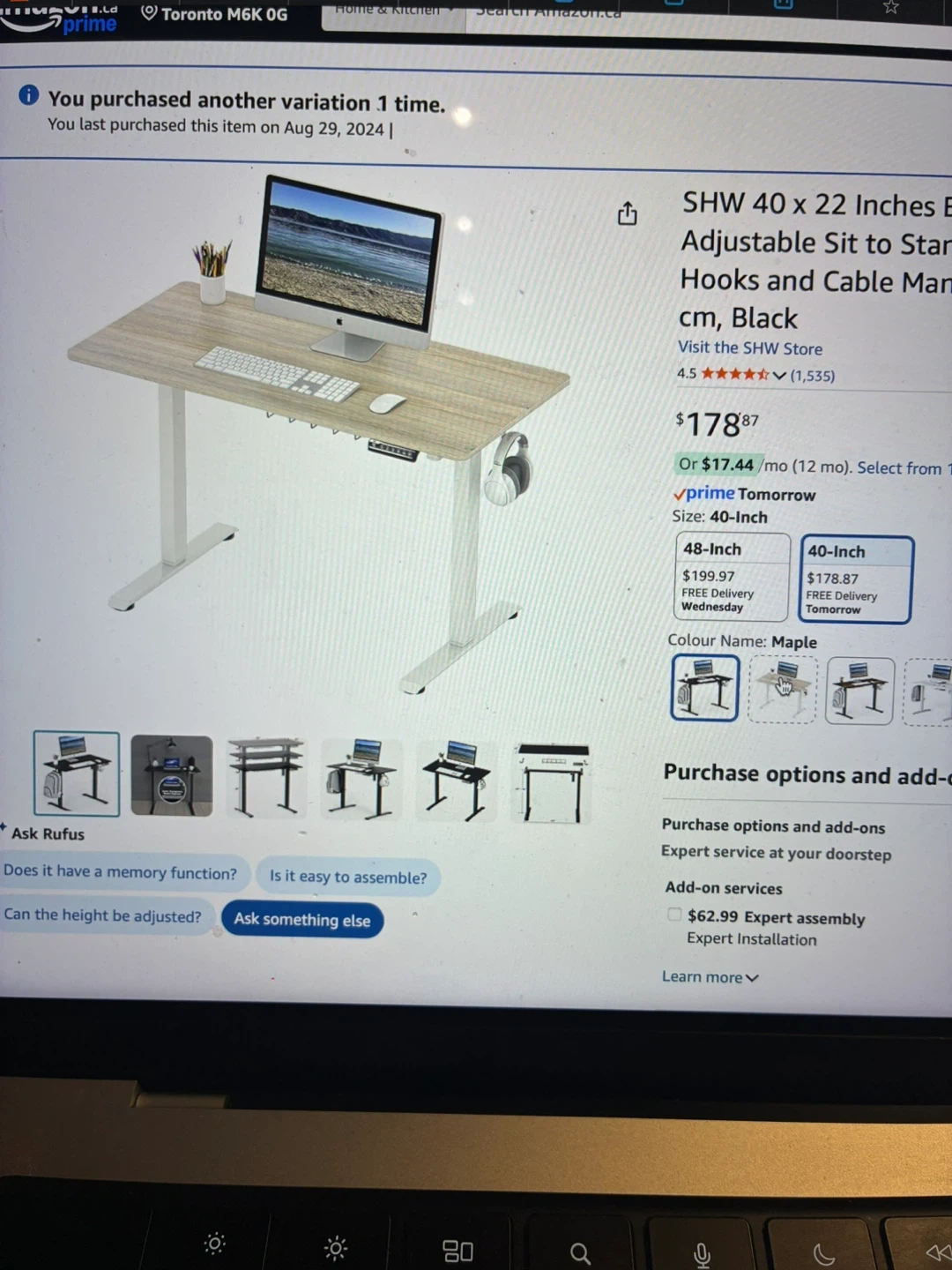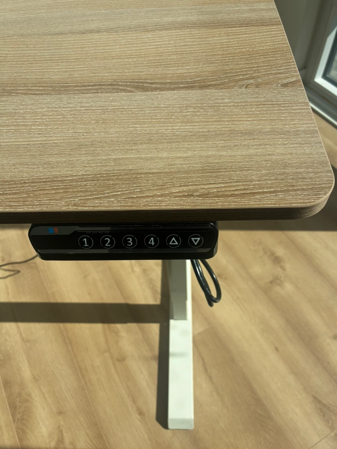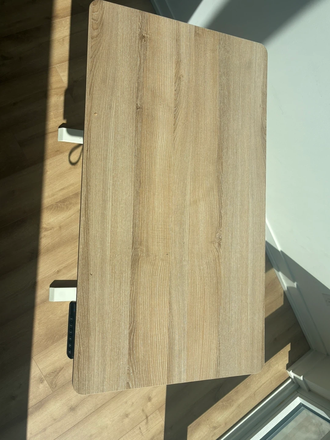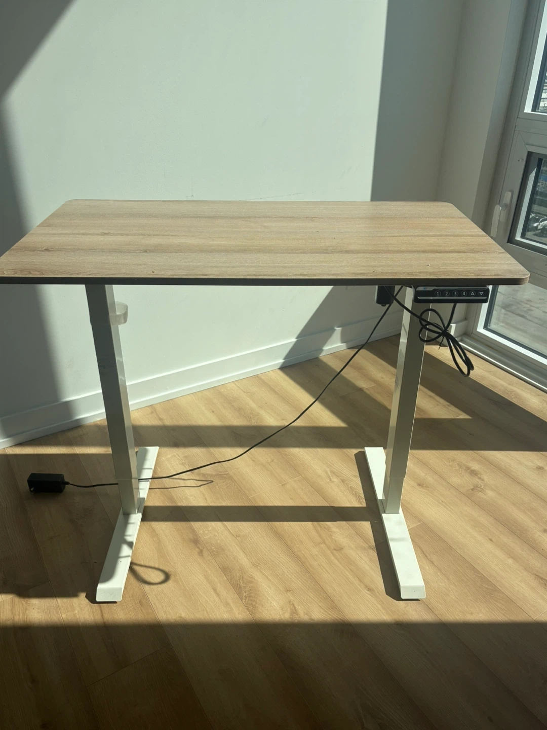 104This is a SHW 40 x 22 inches electric adjustable sit to stand desk. It has a maple color top and white legs. It features hooks and cable management, making it ideal for any home or office setup. Originally bought for $180