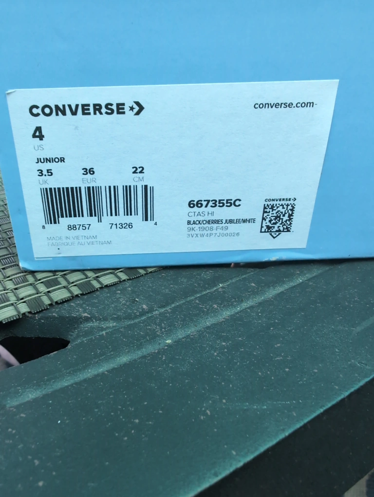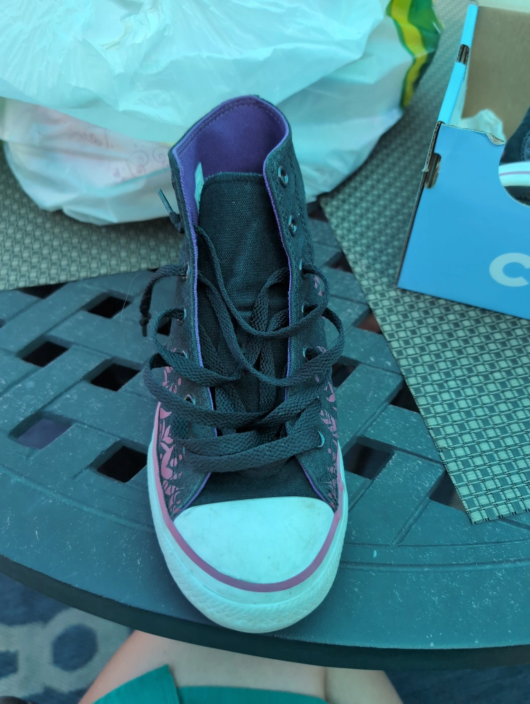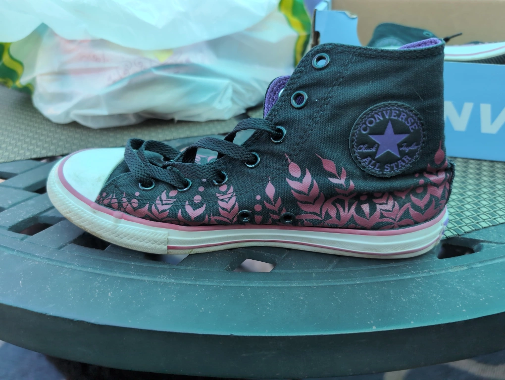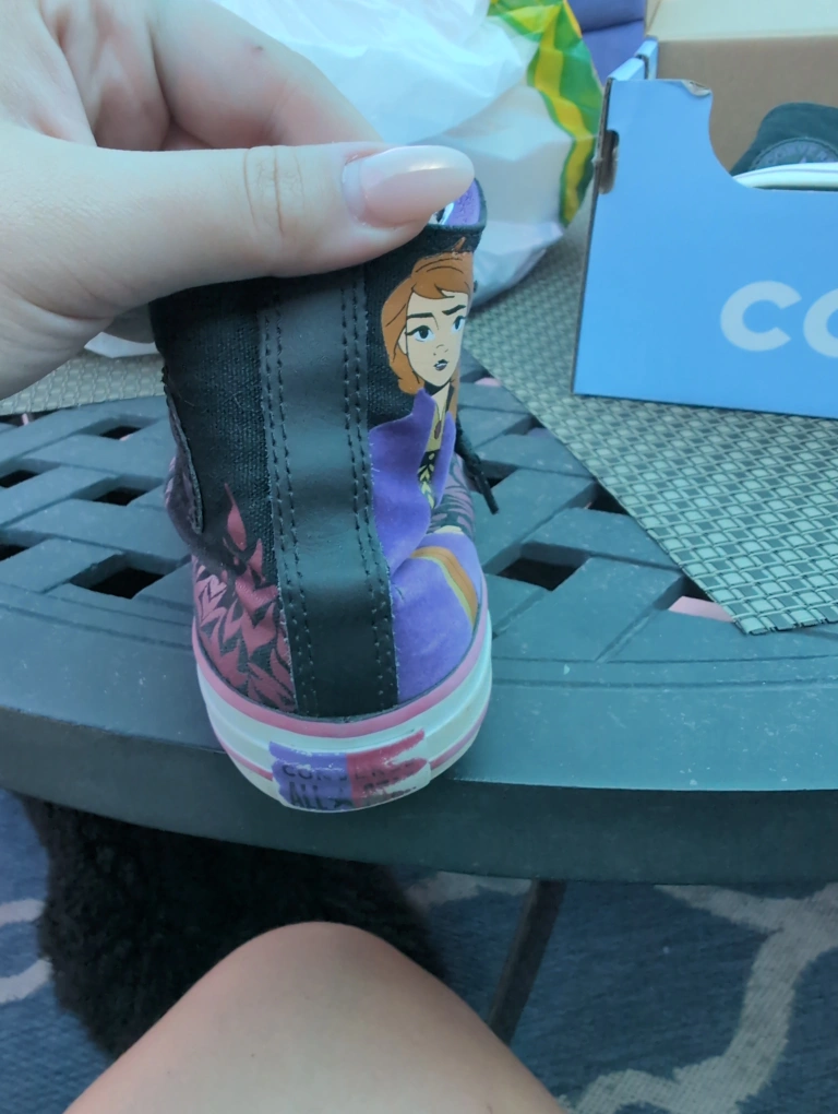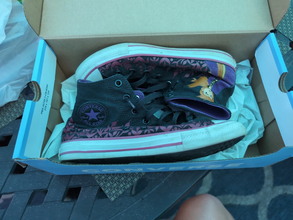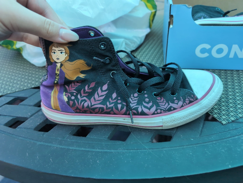 Selling a pair of Converse x Disney Frozen Anna high-top sneakers in a Junior size 4! They feature a cool design with Anna from Frozen and a unique pattern. The shoes are black with purple accents. They come with the original box! need gone ASAP!