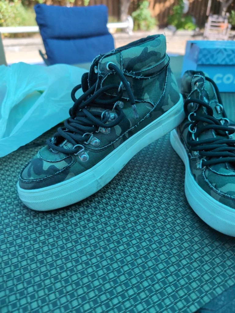 Selling a pair of SODA high-top sneakers in a cool camo pattern! These are in great shape and ready for a new home. They have a classic look with a modern twist. Perfect for adding some edge to your everyday style! Size 7 kids .