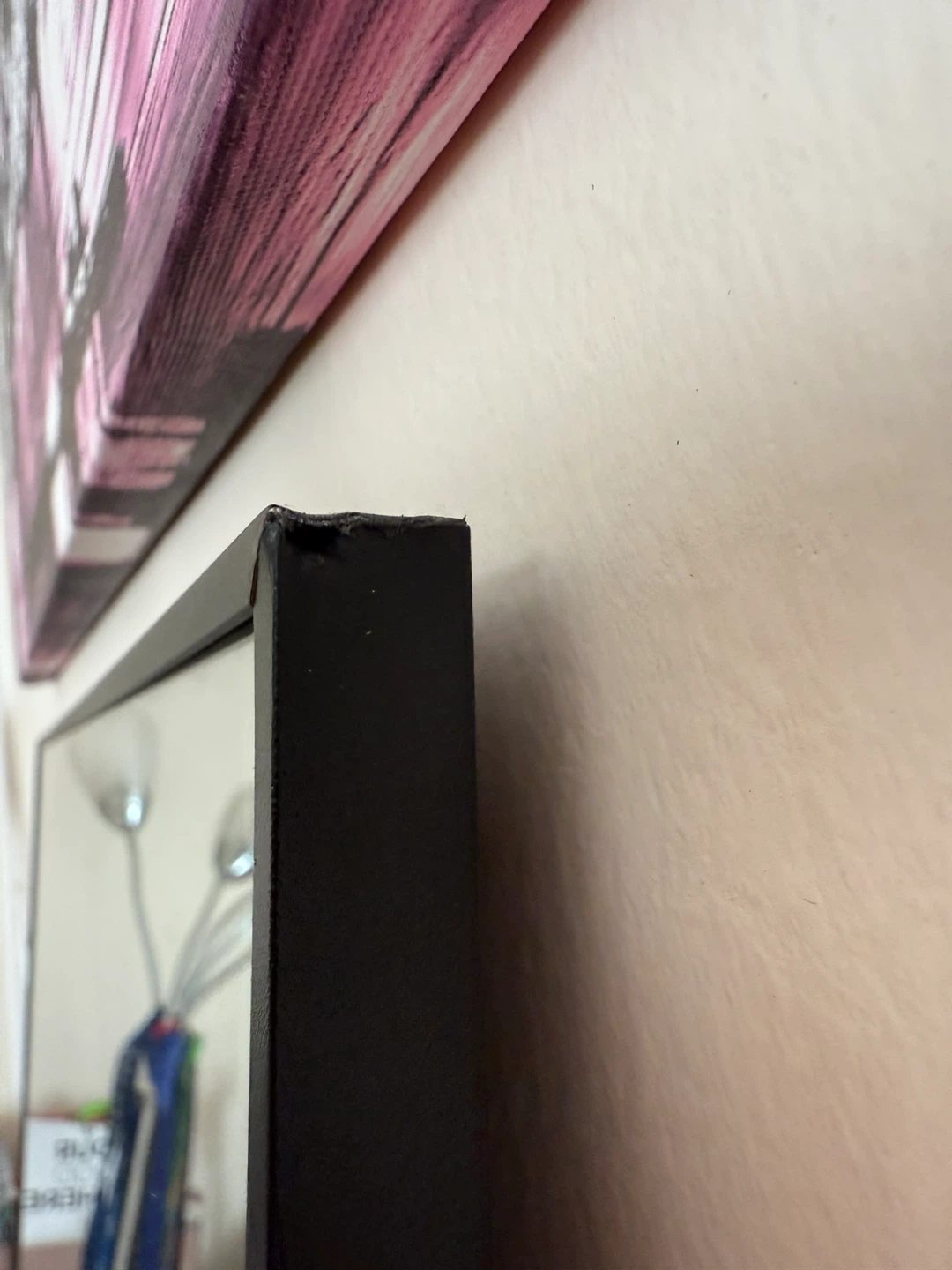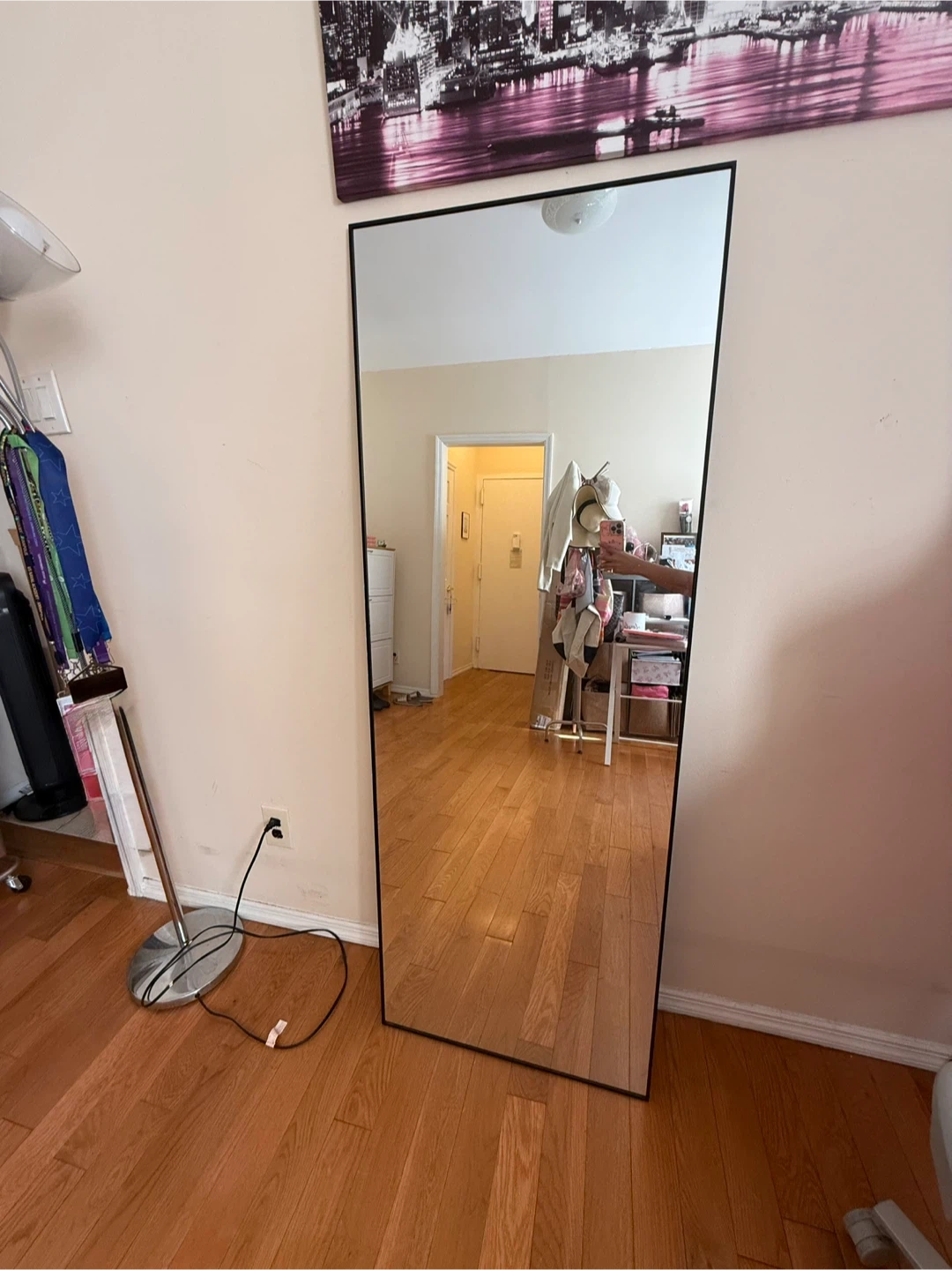 Selling a full length mirror that's in good condition! The dimensions are 64 inches by 24 inches. It has an aluminum alloy frame and can be used as a floor mirror, leaning against the wall, or hanging. The frame is black.