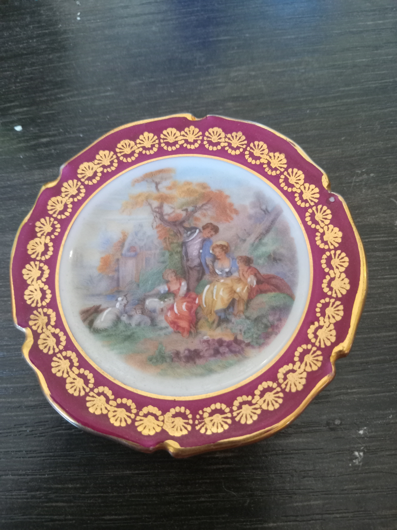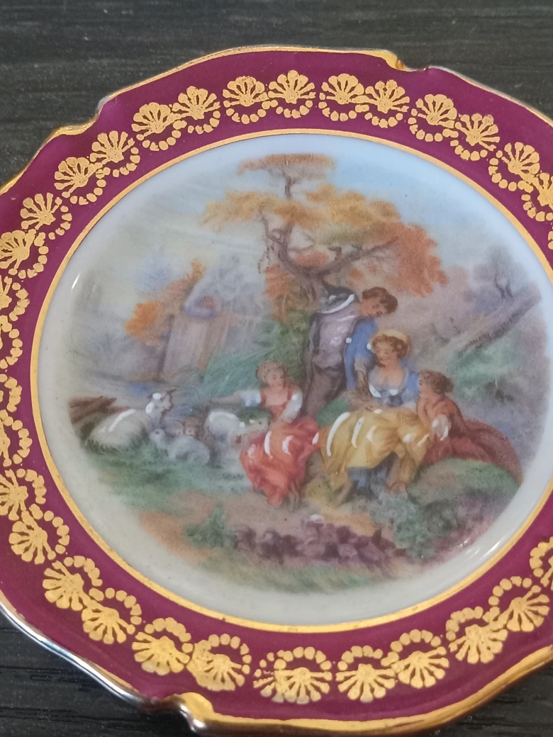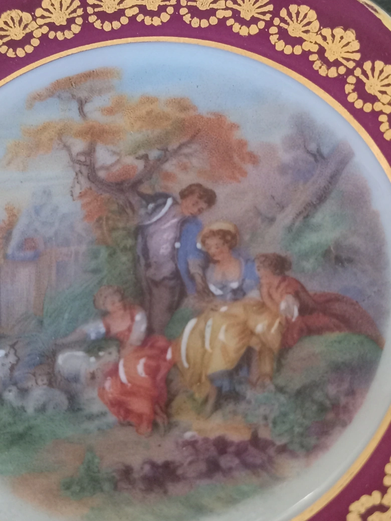 Selling a decorative plate featuring a charming pastoral scene. The plate has a maroon and gold decorative border. It would make a lovely addition to any collection or home decor