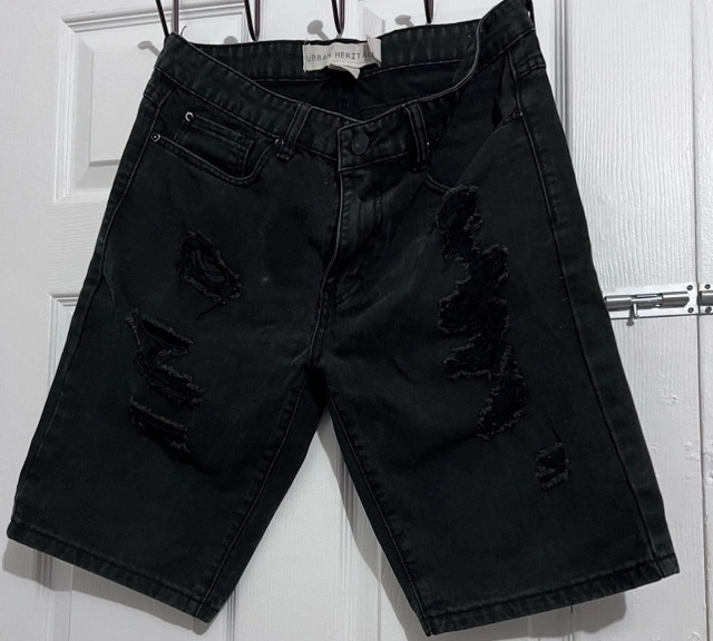 Add some edge to your wardrobe with these Urban Heritage black denim shorts, perfect for a casual yet stylish look. Featuring distressed detailing, these shorts are a size medium and offer a comfortable fit for everyday wear. These shorts have some wear, adding to their unique character.