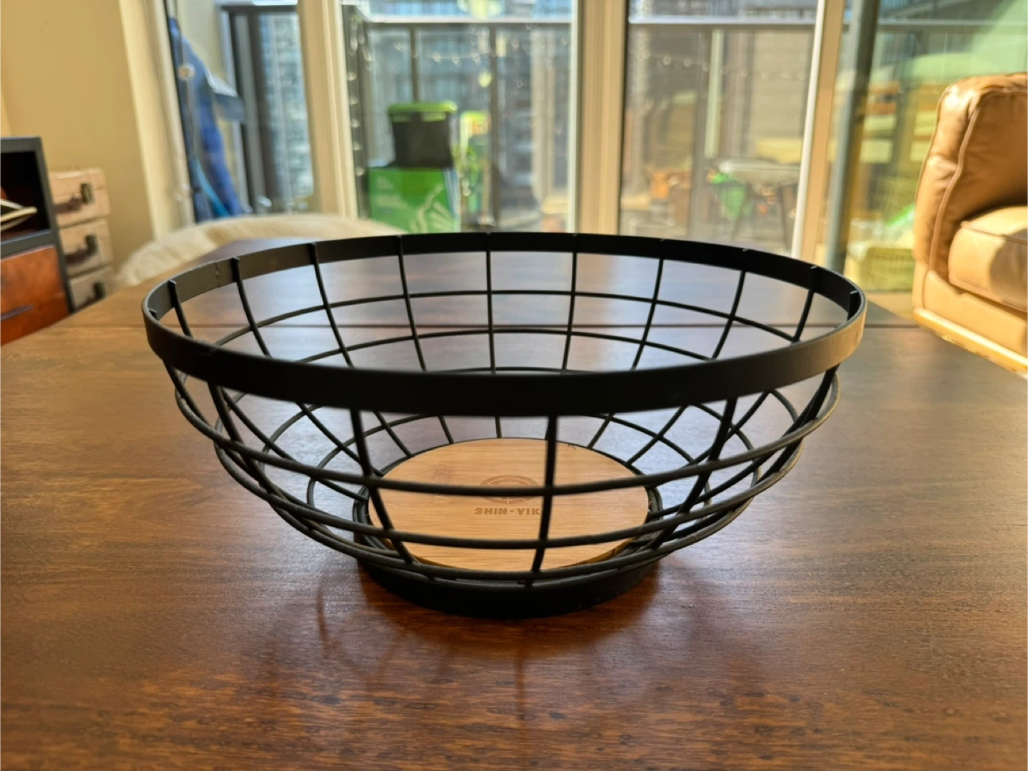 392Selling a stylish black wire fruit bowl featuring a lovely wooden base. It's perfect for adding a modern touch to your kitchen or dining area. Great for holding fruits or other household items!