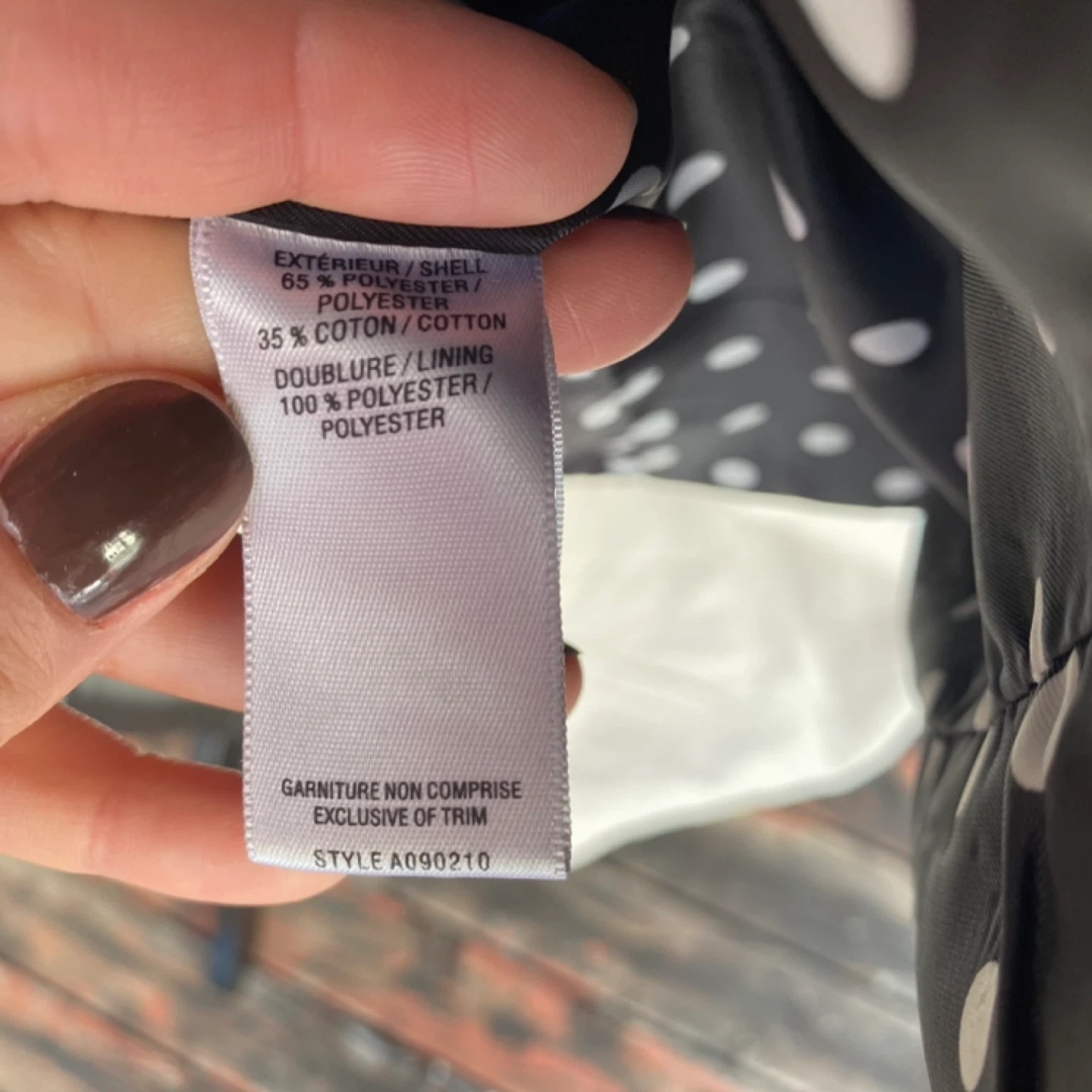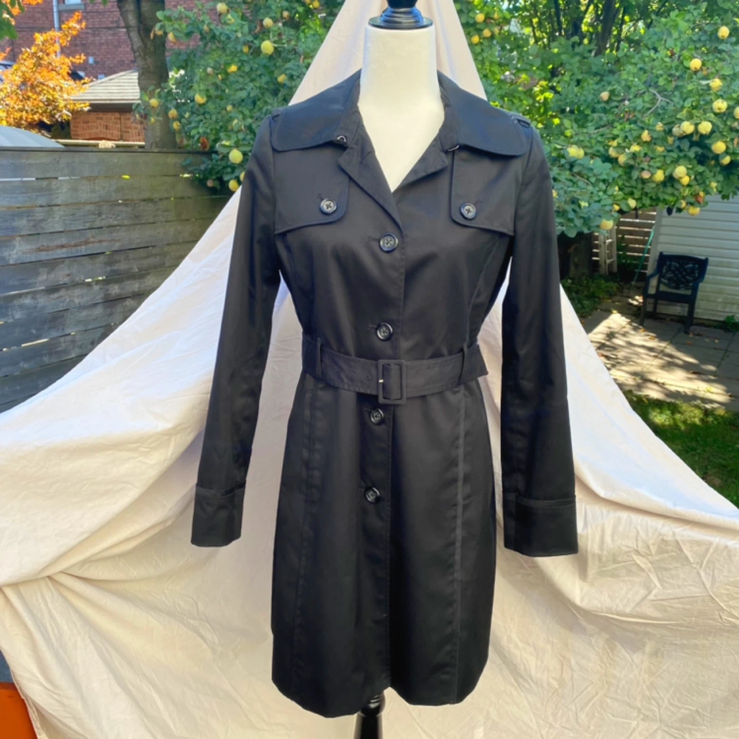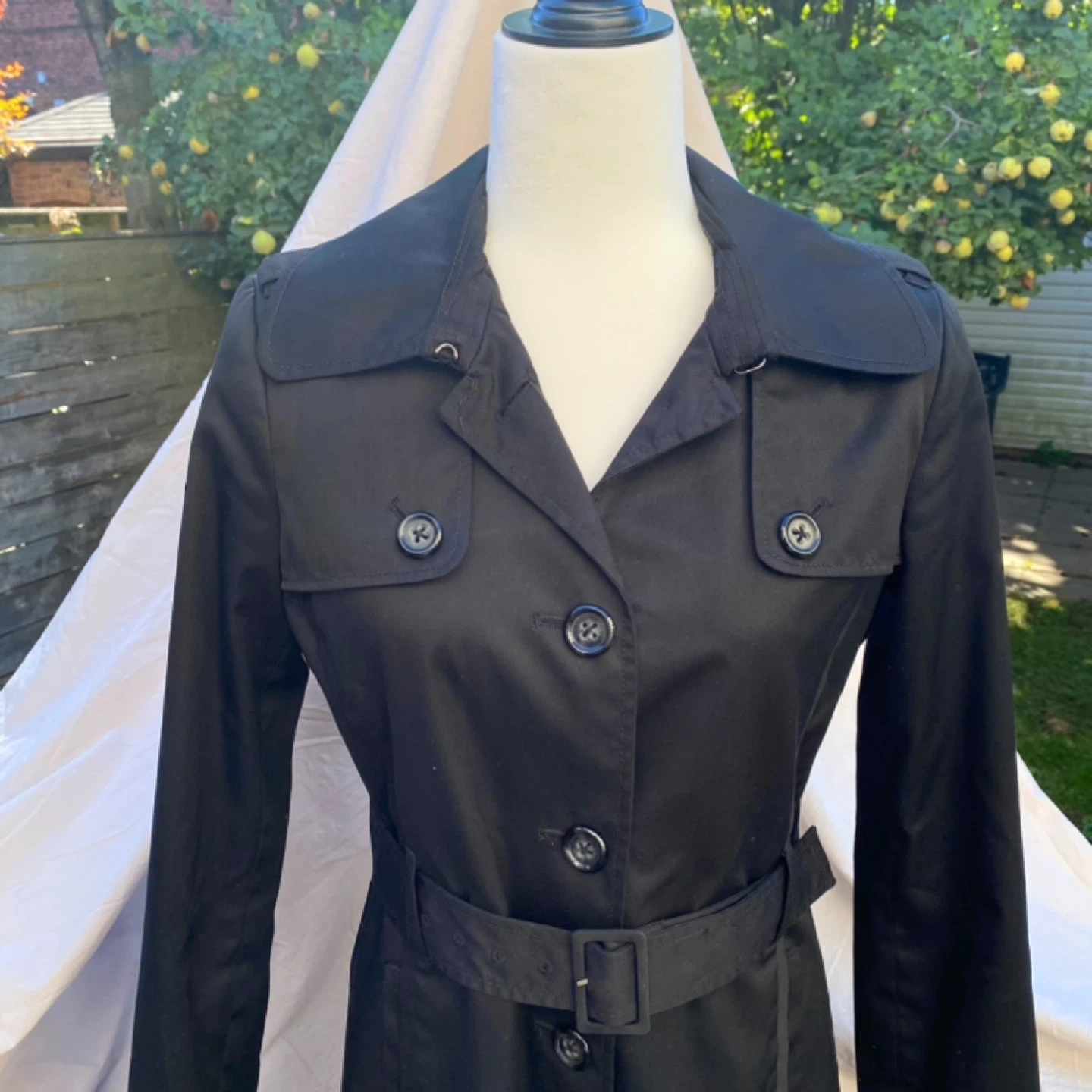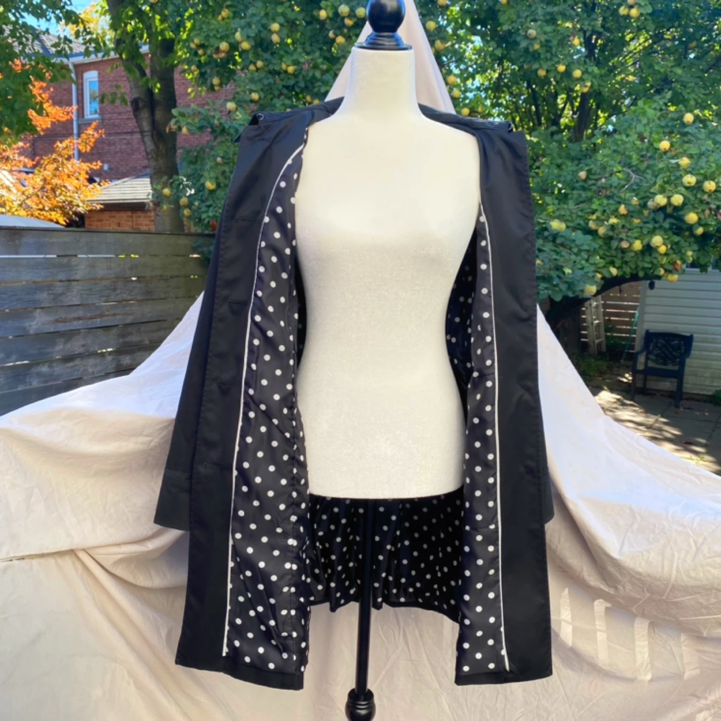A black trench coat. Features adjustable belt around the waist. Great for keeping you dry on a rainy day. The inner lining has white polka dots.