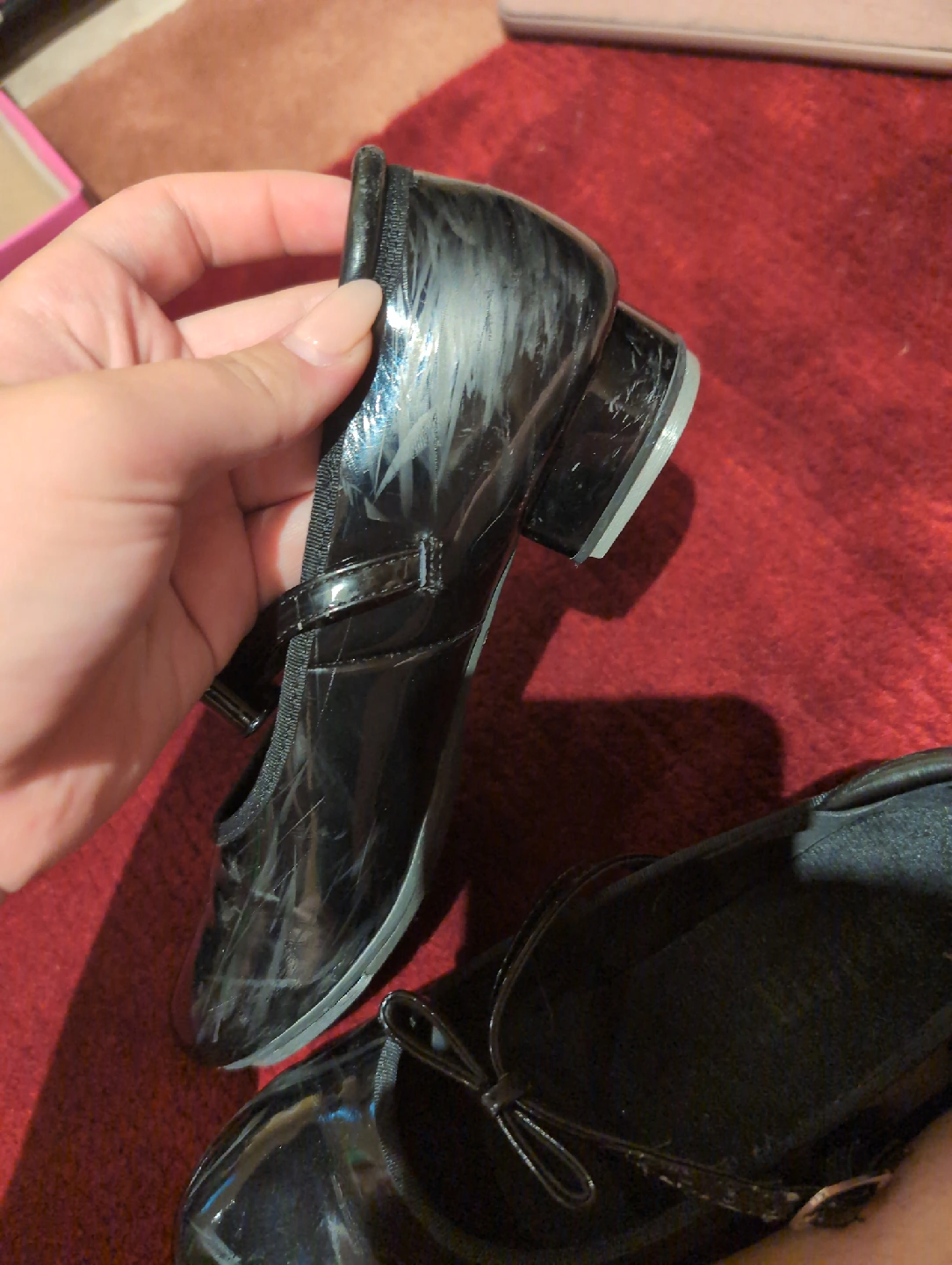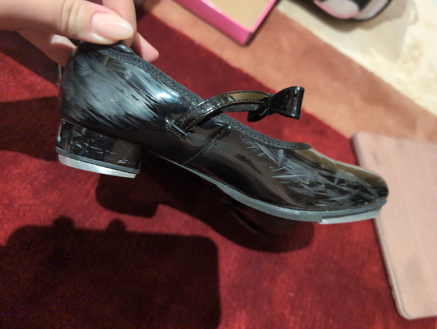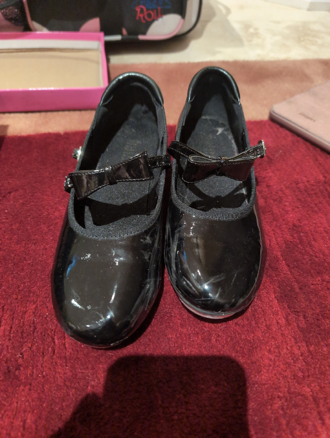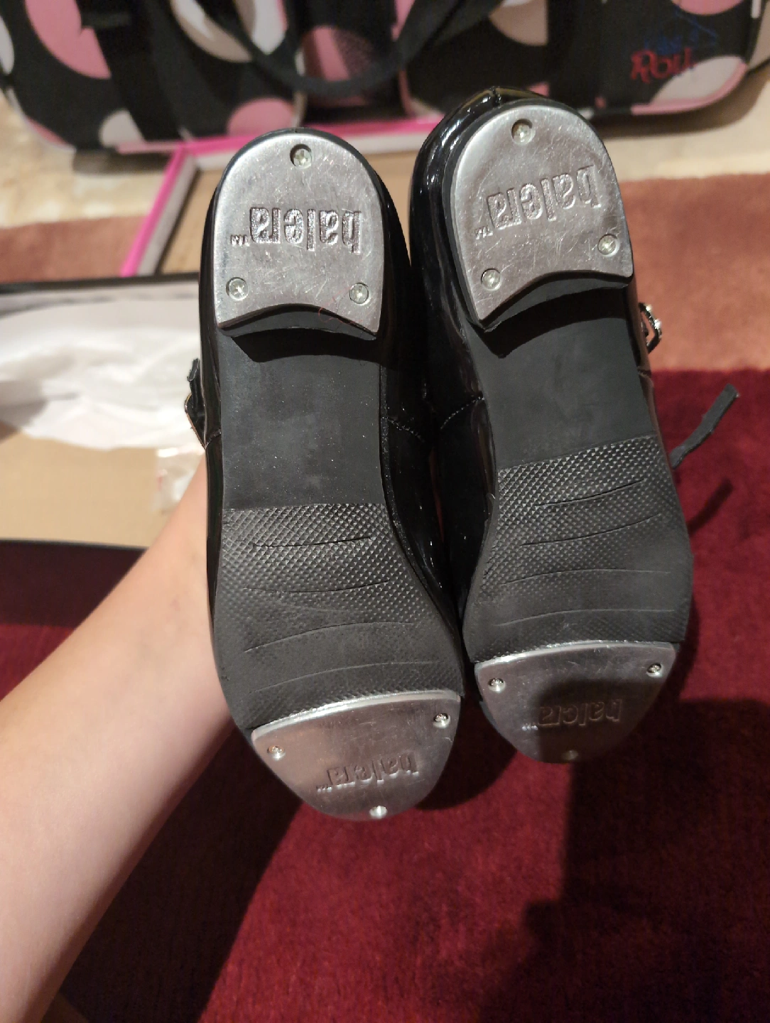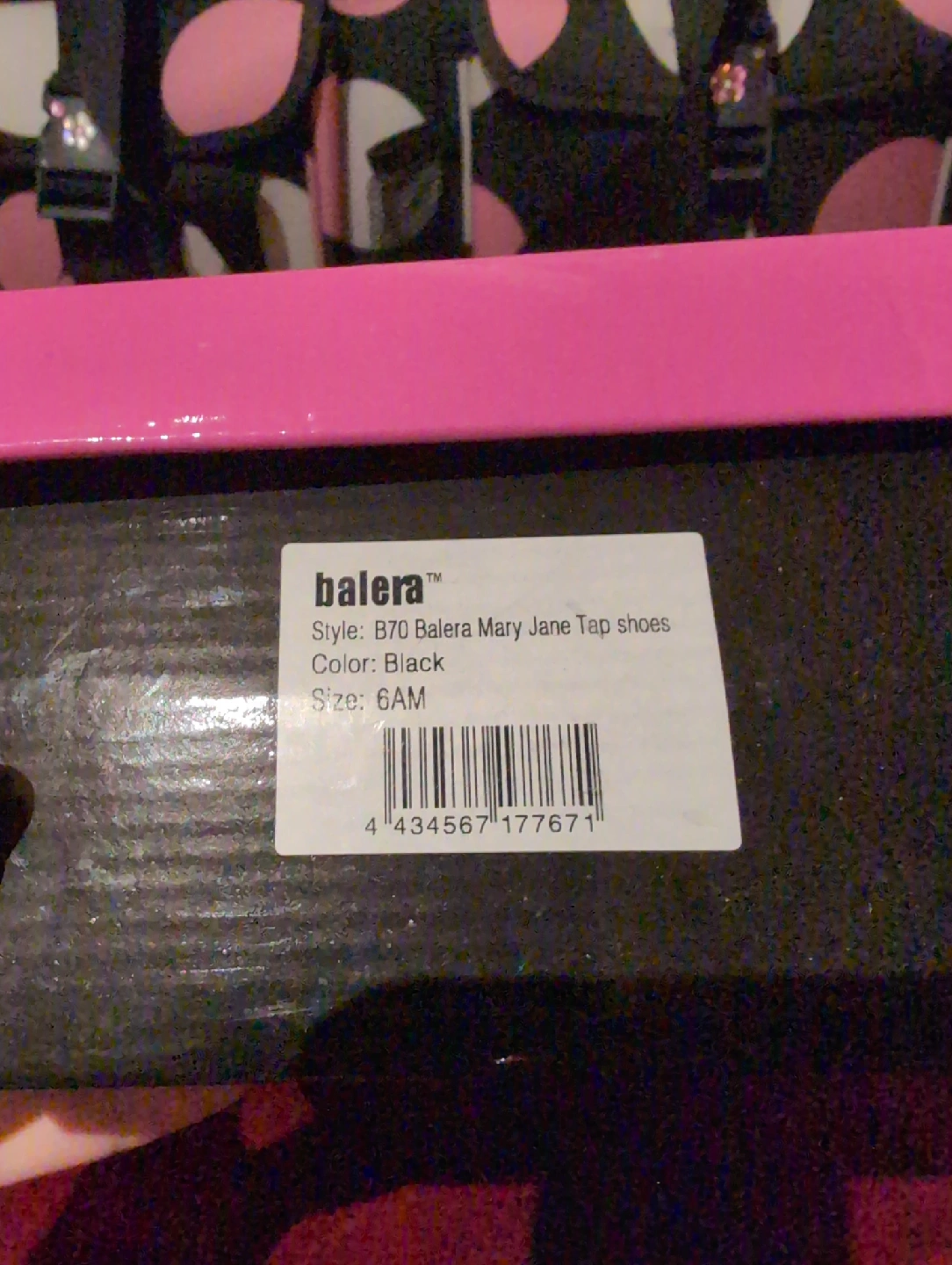 Selling a pair of Balera Mary Jane tap shoes in black, size 6AM. They show some signs of wear on the sole and straps, as shown in the pictures. The original box is included!