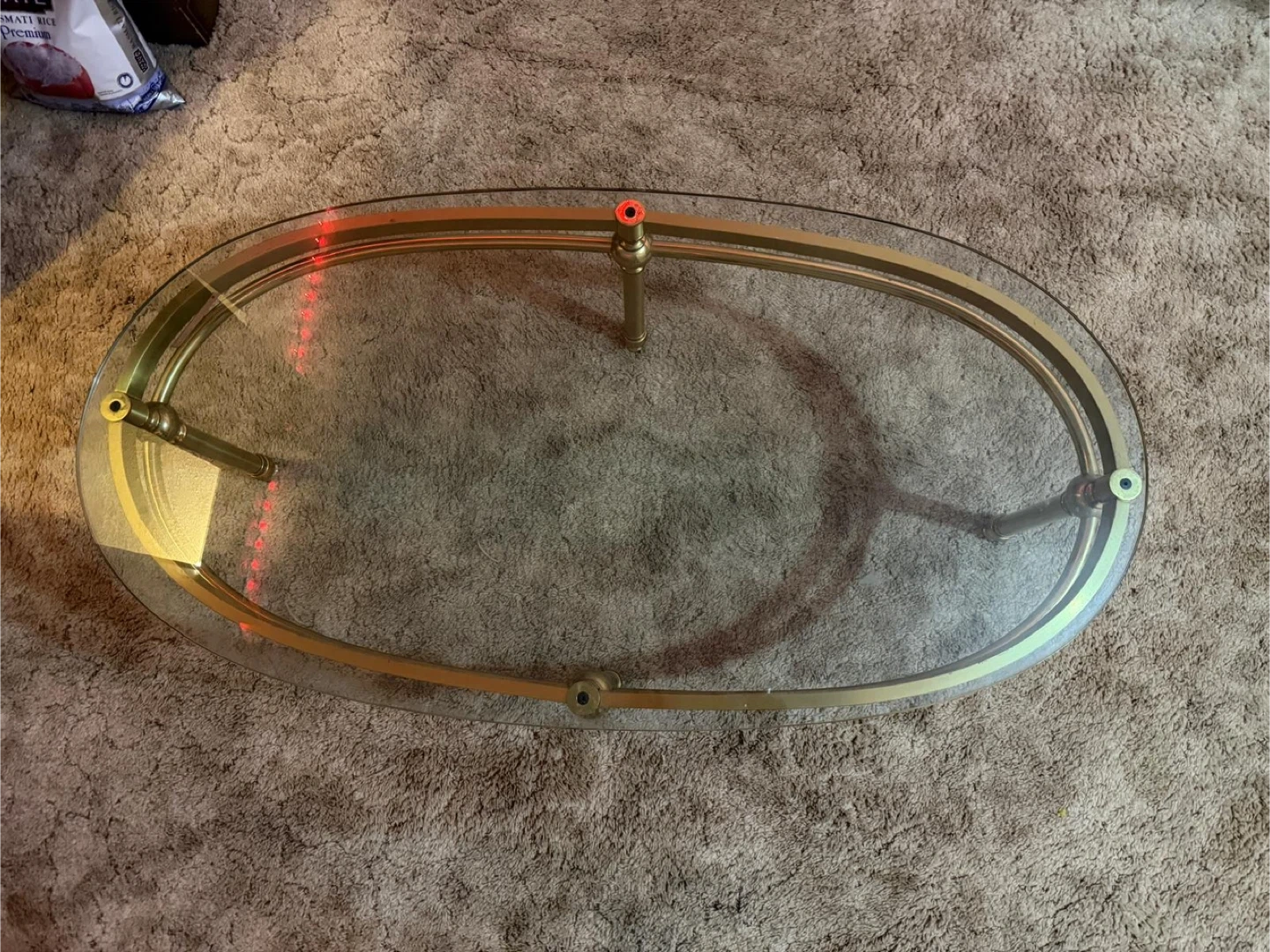 Selling a stylish oval coffee table with a glass top and gold-coloured frame. It's in great condition and would look lovely in any living room! The sleek design adds a touch of elegance to your space. It's a sturdy and beautiful piece of furniture.
