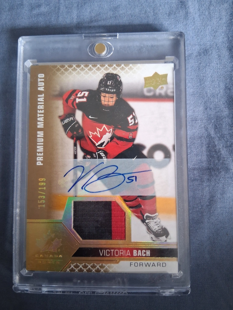 Selling a Victoria Bach Upper Deck Premium Material Auto hockey card, numbered 153/199. It's in great condition and comes in a protective case. A fantastic addition for any hockey card collector!