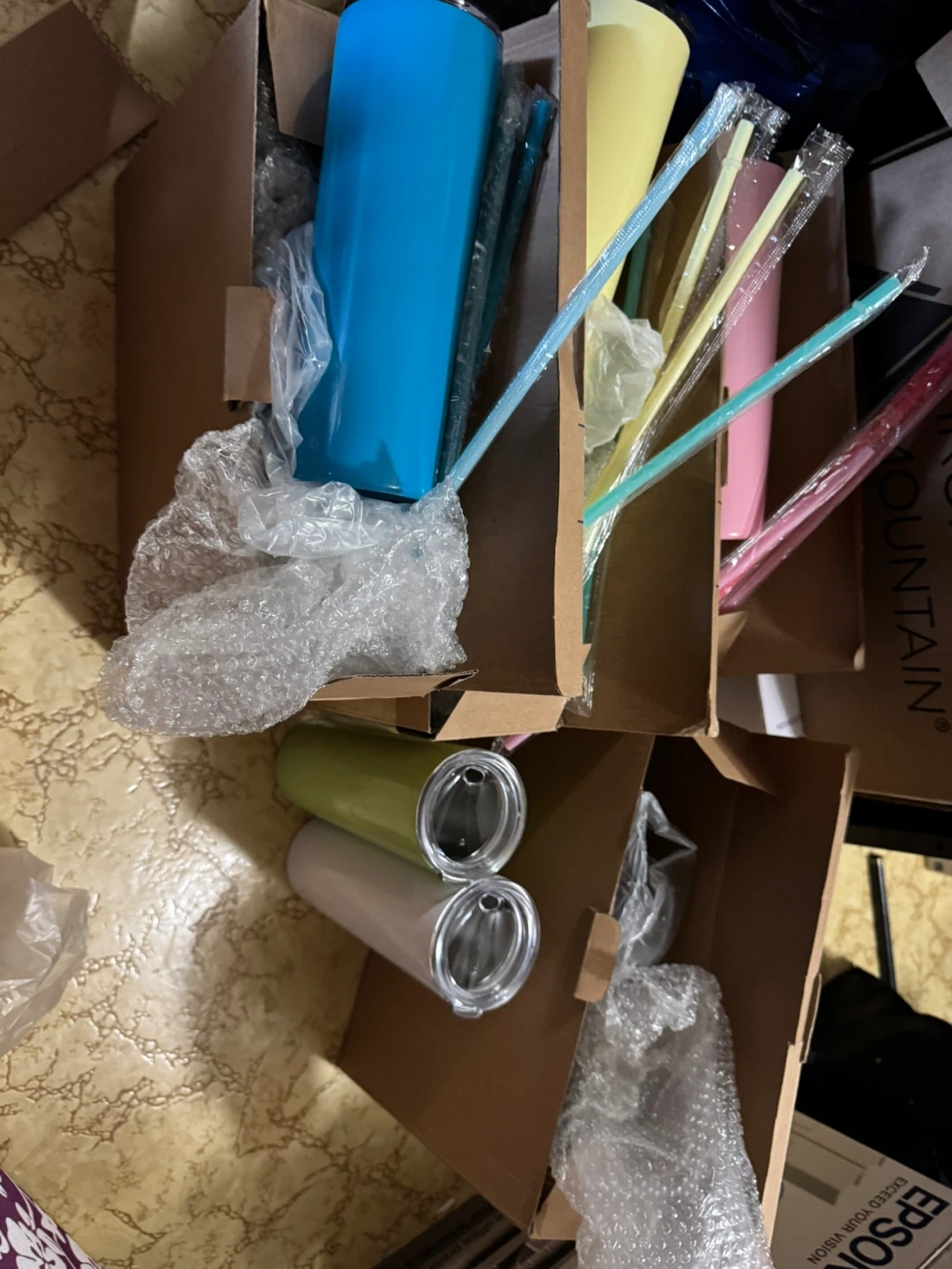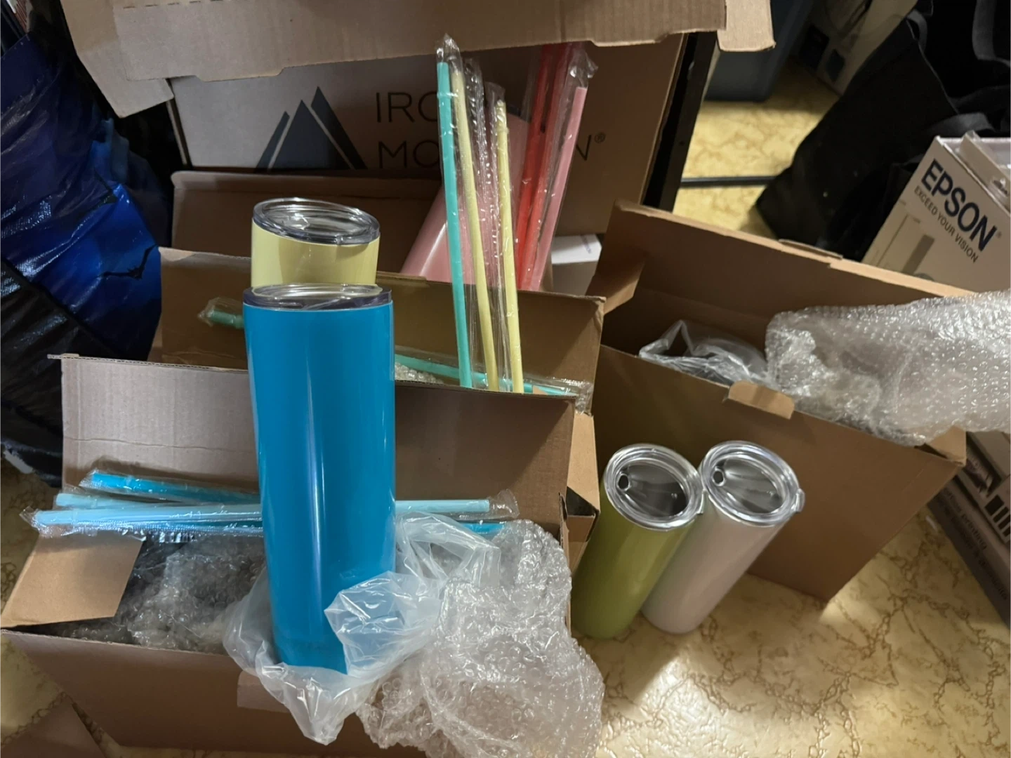 I have some Maars 20oz steel tumblers for sale, still new in their boxes! They come in a variety of colours, including seafoam and aqua. Perfect for keeping your drinks cold or hot on the go! There are 15 of them and $7 each