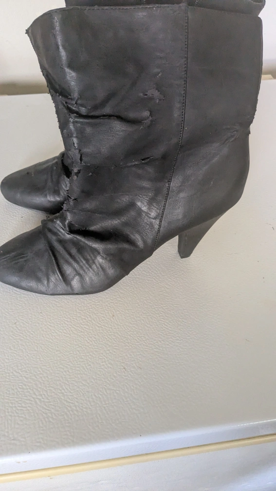 These black leather heel boots are looking for a new home! They definitely show signs of wear and tear, as you can see in the photos. Still, they might be perfect for a DIY project or someone who appreciates a vintage look. Please take a close look at the pictures to see the condition