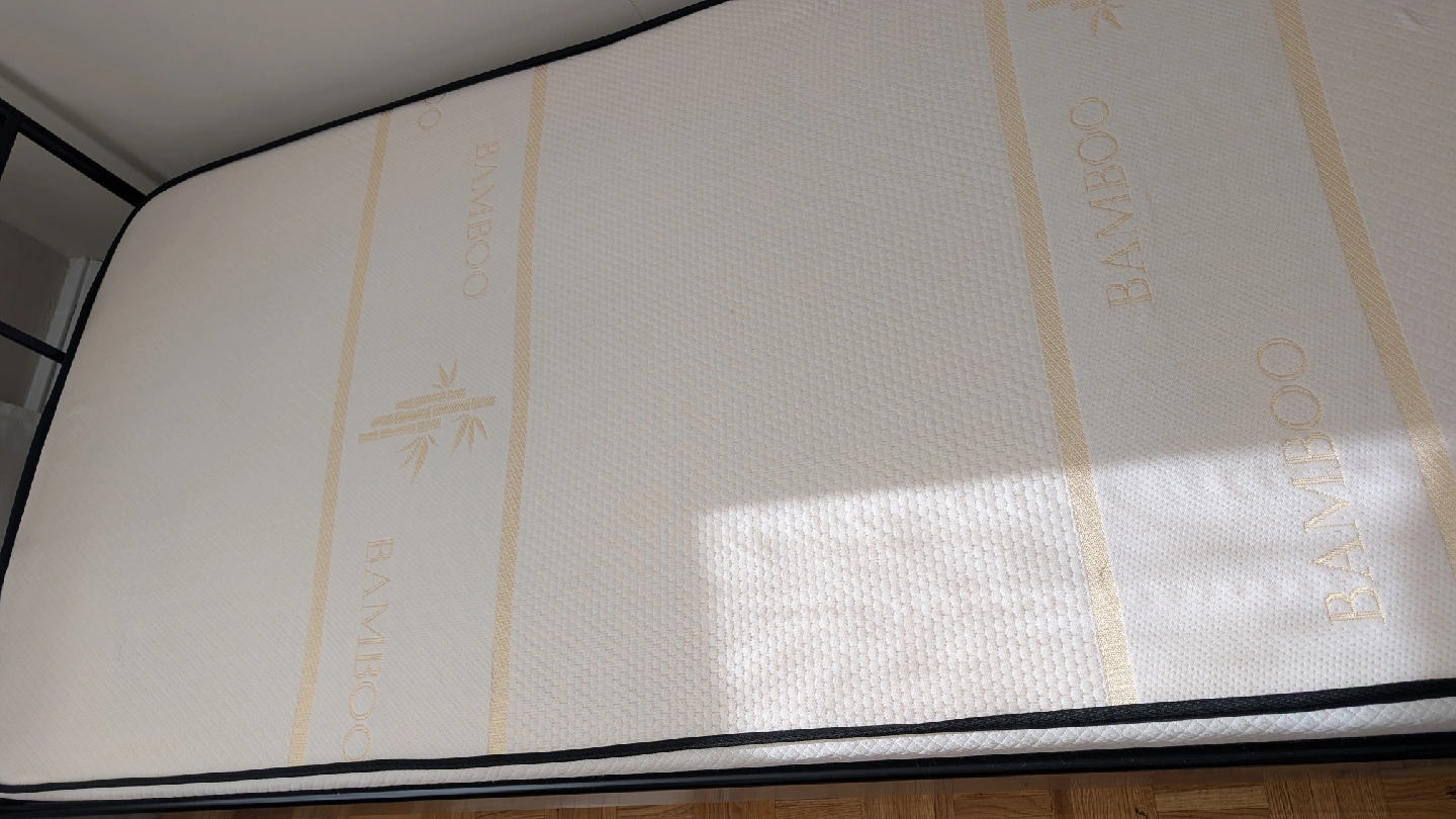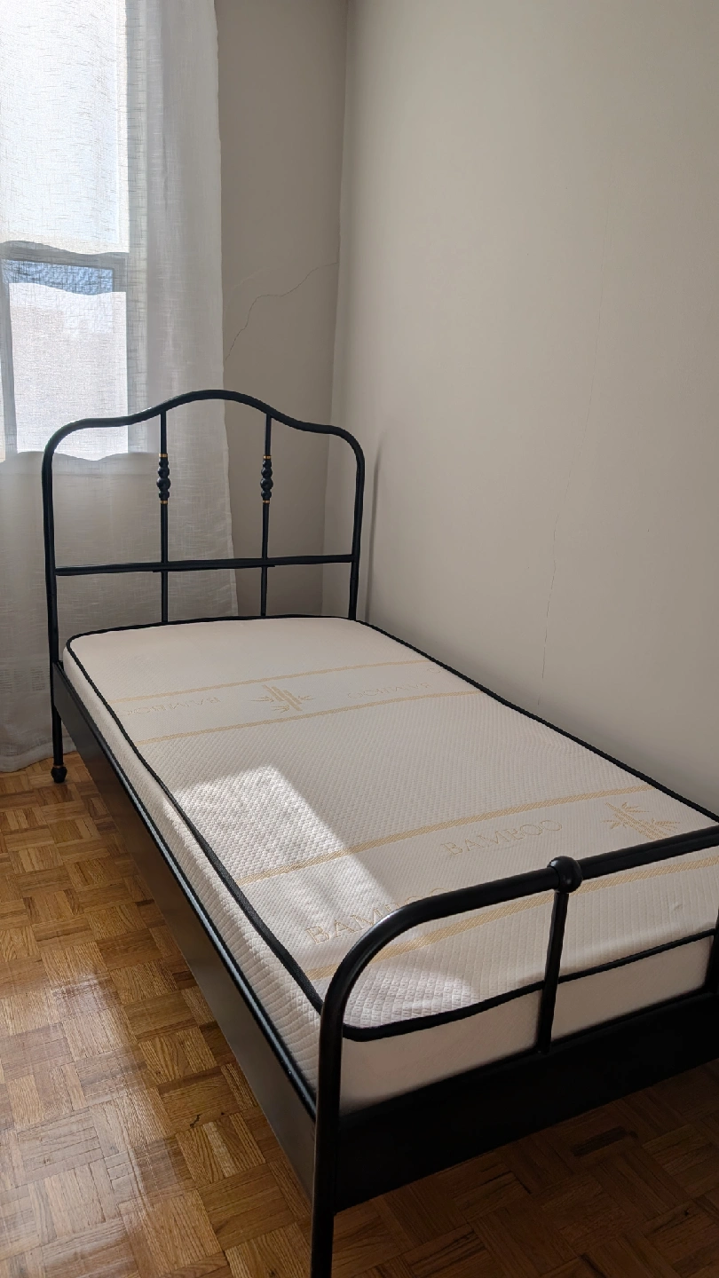 The bedframe comes with a gently used bamboo mattress. Clean, pet and smoke free