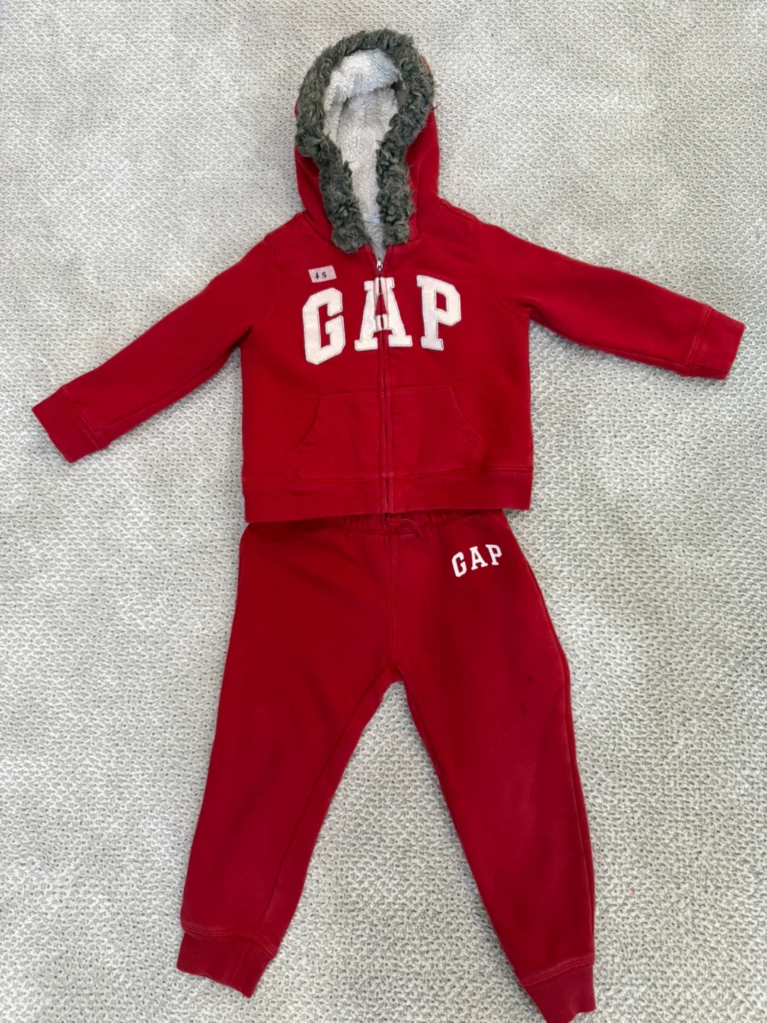 10Selling a cute GAP kids tracksuit in red! It's a cozy fleece set, perfect for keeping your little one warm. The set includes a zip-up hoodie with a faux fur trim and matching track pants. Size is 4