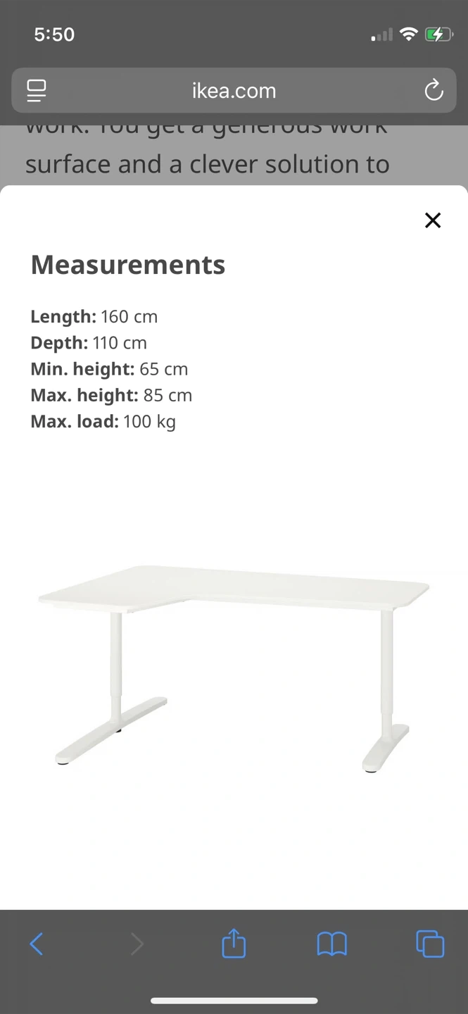 Selling a white Ikea BEKANT corner desk in great condition! It measures 160 cm in length and 110 cm in depth. The height is adjustable, with a minimum of 65 cm and a maximum of 85 cm. It's a clever solution for creating a generous workspace - selling as my den is a bit too small.