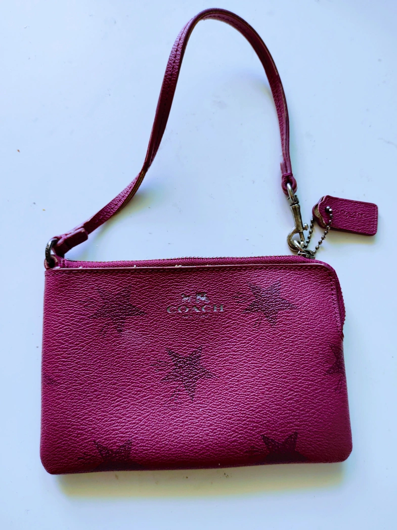 A cute burgundy Coach wristlet! It's in good condition, perfect for carrying your essentials when you're on the go. The leather has a nice texture and the star design adds a bit of fun