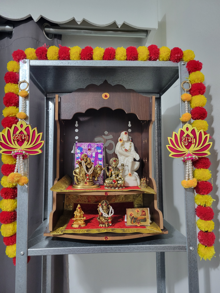 Small pooja mandir along with assorted hindu god idols, festive decorations.