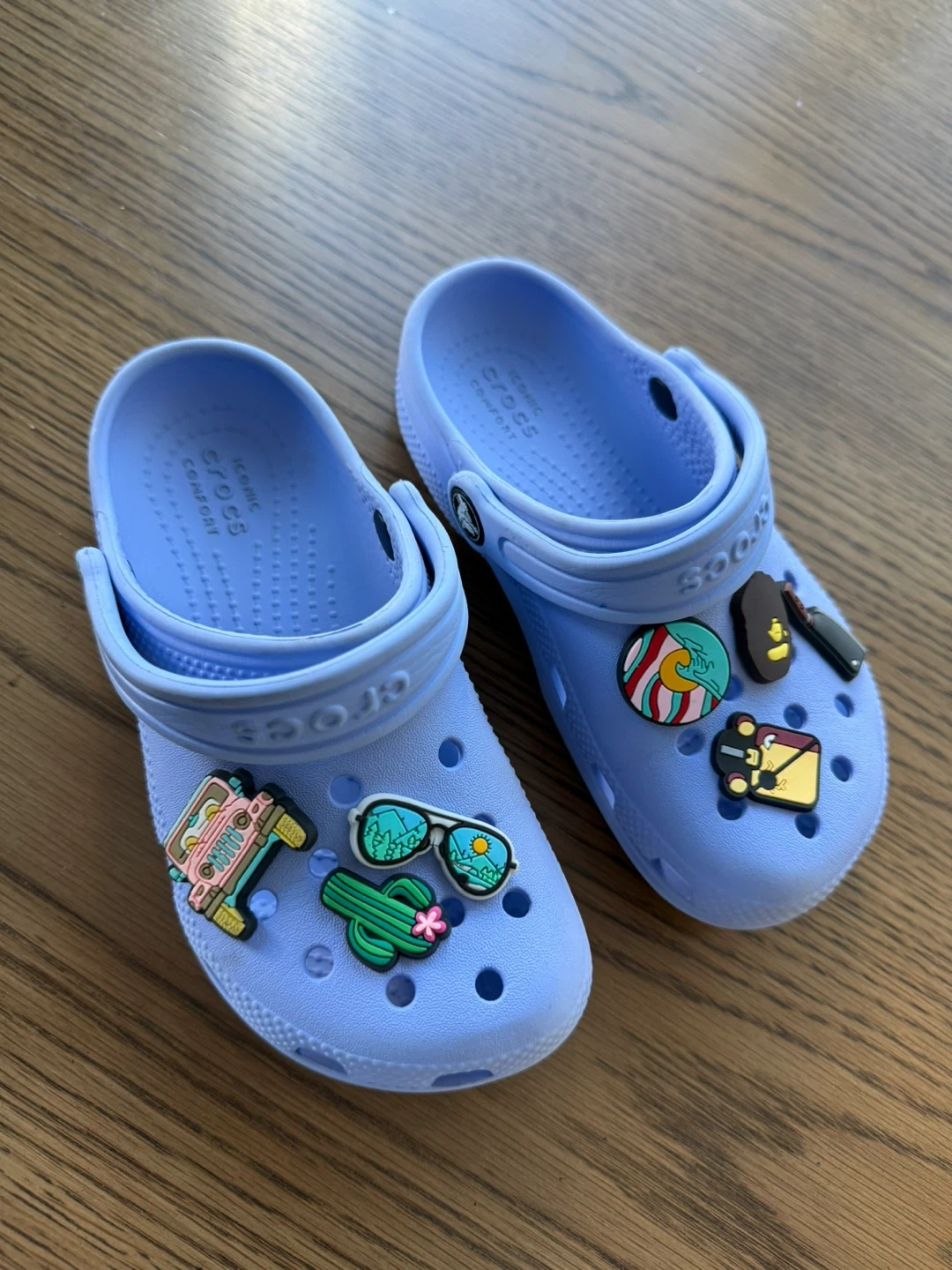 Selling a pair of light blue Crocs clogs in size 12. They're in great shape and come with fun jibbitz to personalize them! Perfect for little feet and easy to clean