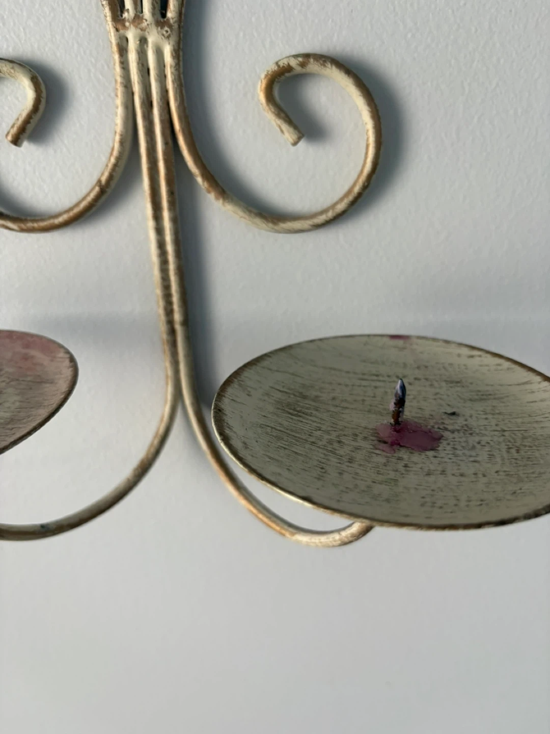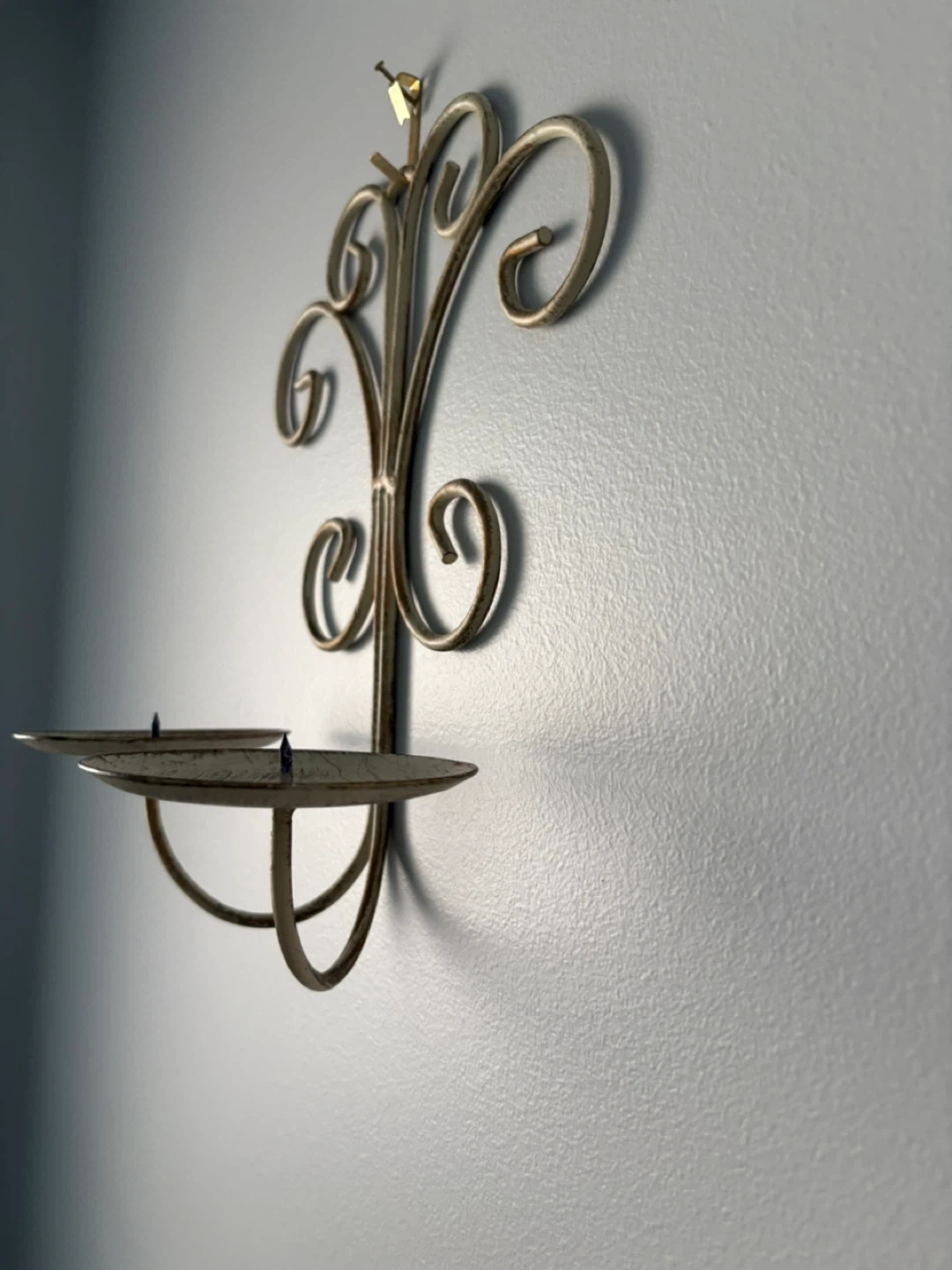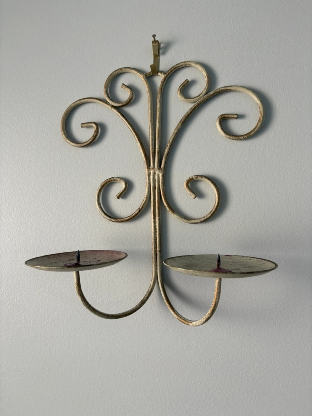 20Add a touch of vintage charm to your home with this metal candle holder wall sconce! It features a decorative, swirling design and two candle platforms. Perfect for creating a cozy atmosphere in any room