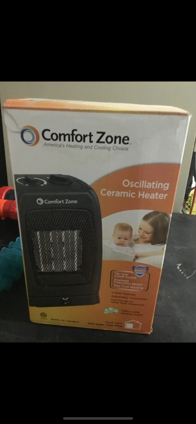 Comfort Zone oscillating ceramic heater. It has two heat settings and an adjustable thermostat. It's fan-forced for wide heat dispersion and has a tip-over cutoff switch. Model number CZ448CH. Helps lower heating costs and great for a small room
