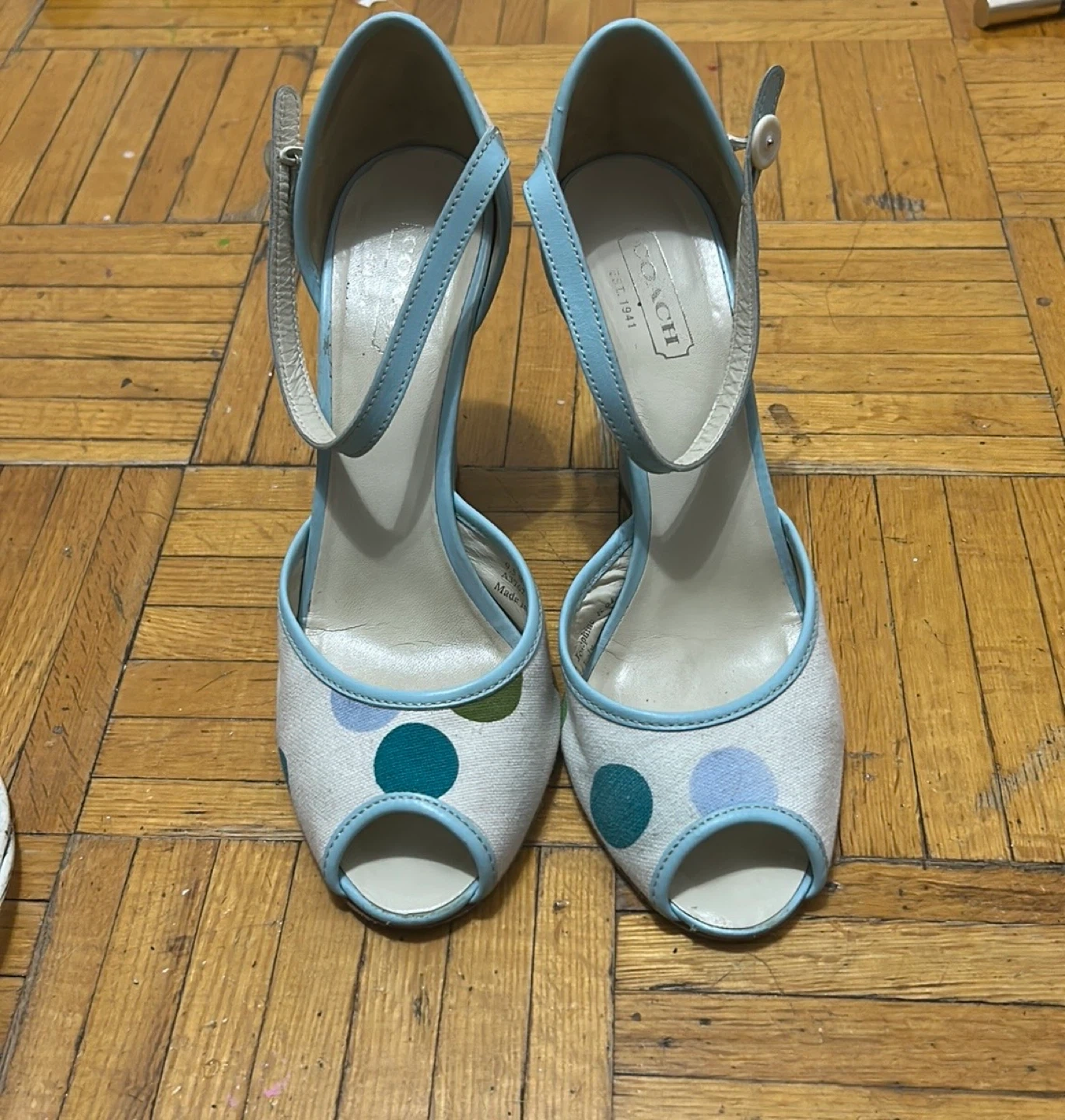 Selling a pair of Coach Josephine heels in size 9.5. These peep-toe wedges feature a cute polka dot pattern in shades of blue and green. Made in Italy, these heels are a stylish addition to any wardrobe. i need them gone as soon as possible