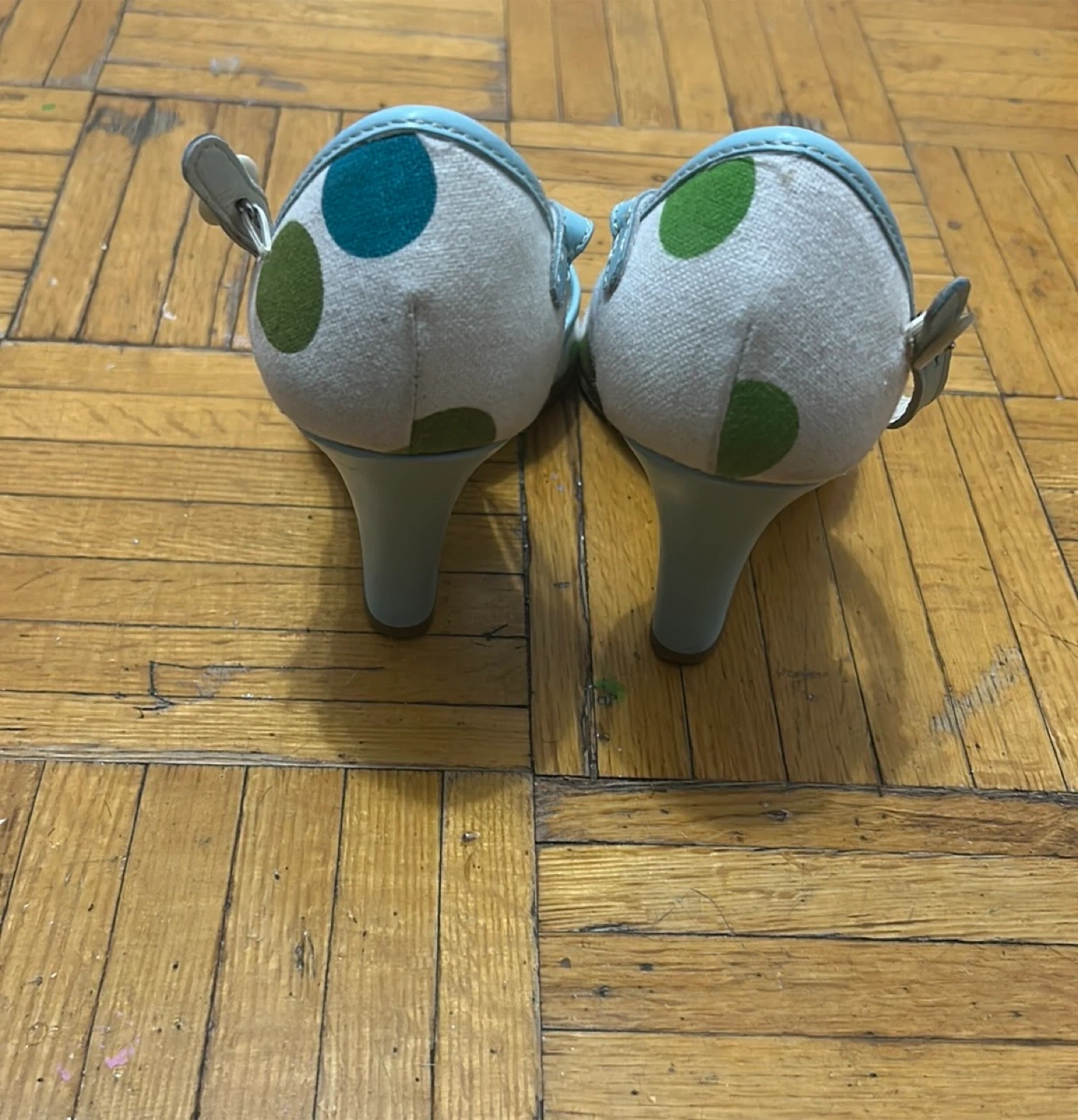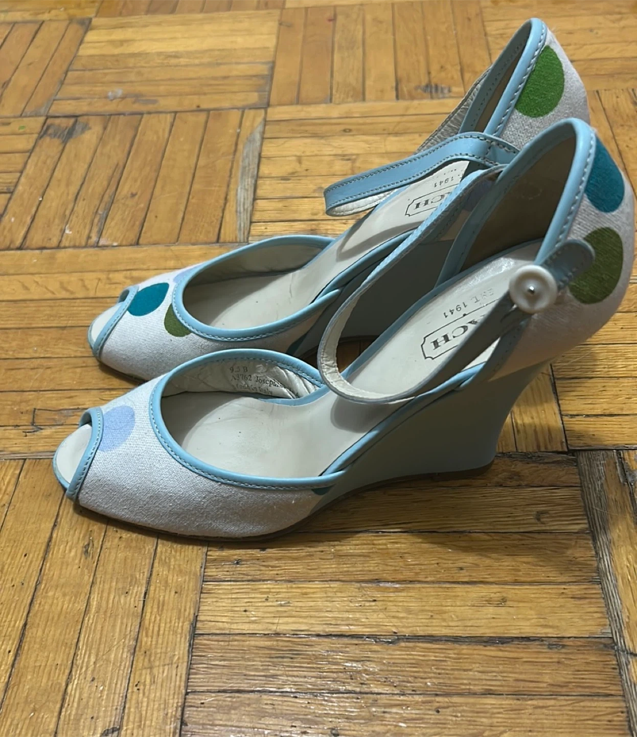 Selling a pair of Coach Josephine heels in size 9.5. These peep-toe wedges feature a cute polka dot pattern in shades of blue and green. Made in Italy, these heels are a stylish addition to any wardrobe. i need them gone as soon as possible