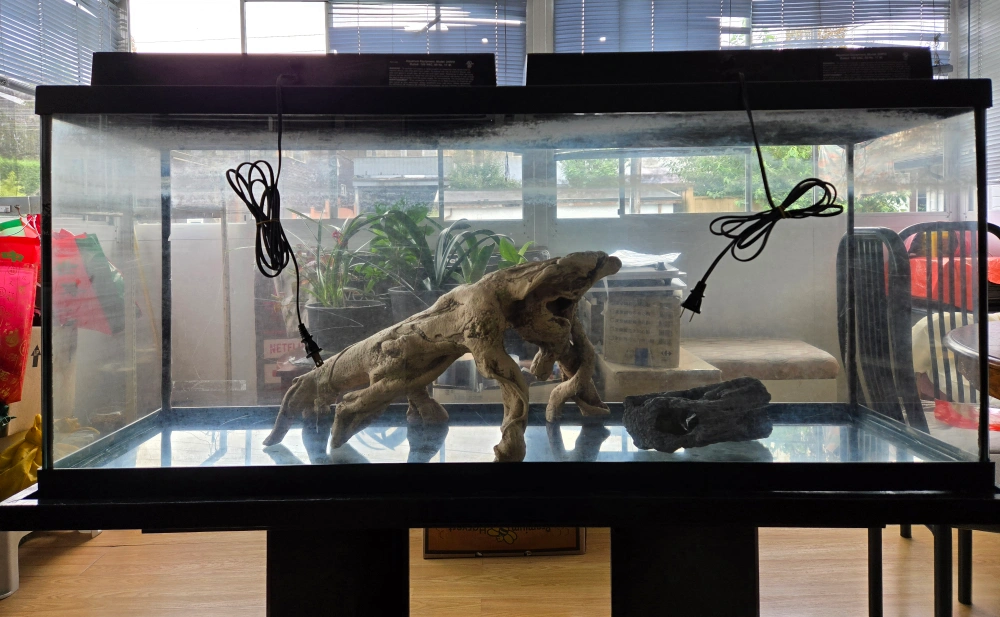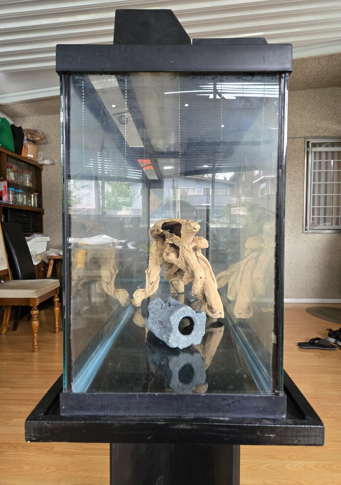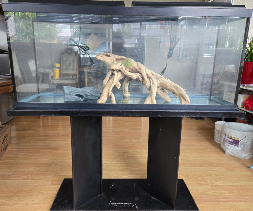 55-gallon aquarium comes with a sturdy stand. Includes lids and lights, large and medium ornaments also come with black and white sand if you're interested.