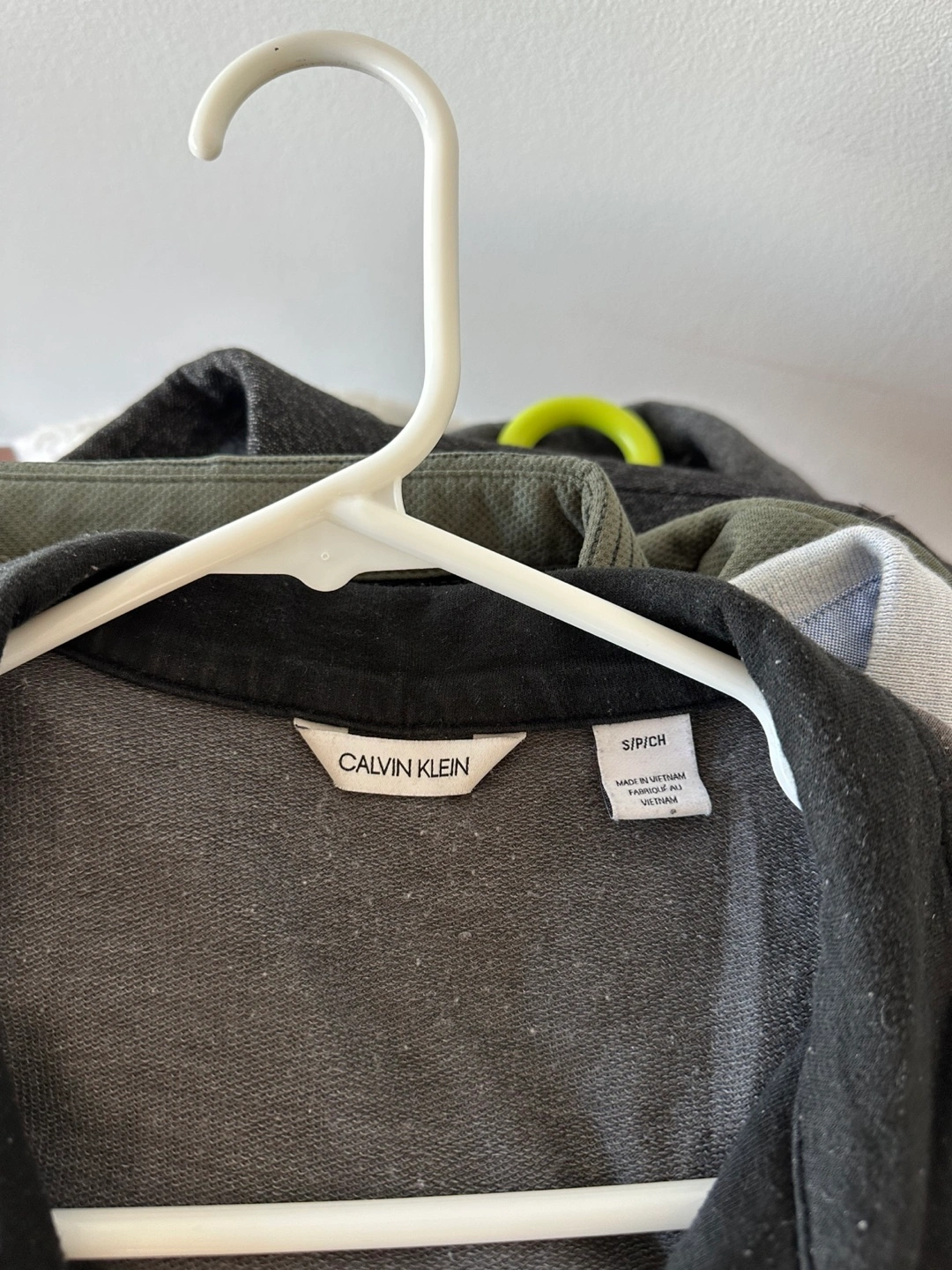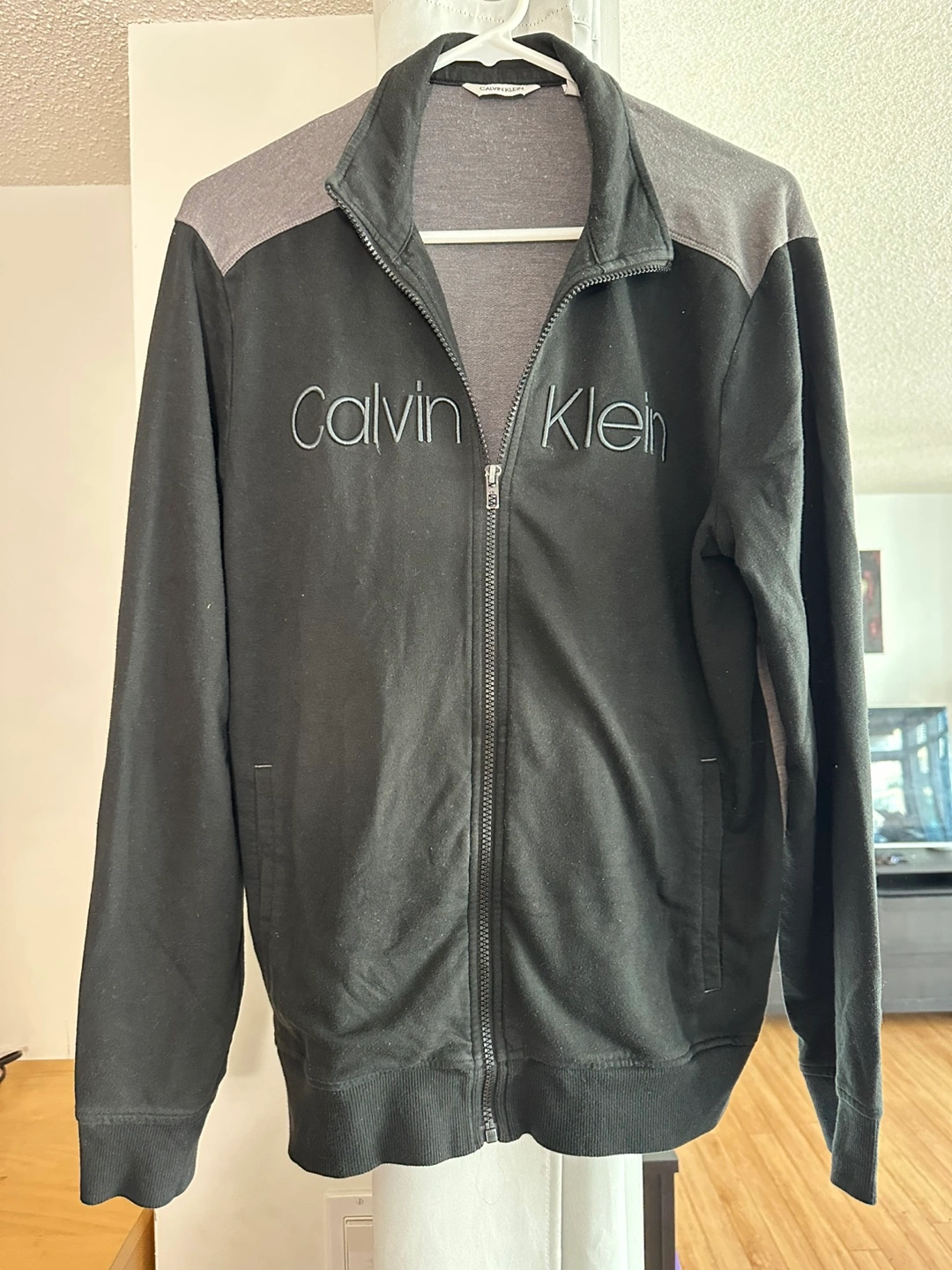 Selling a Calvin Klein zip-up jacket in a stylish black and grey colour combination! It's a size small and in great condition. Perfect for layering or wearing on its own