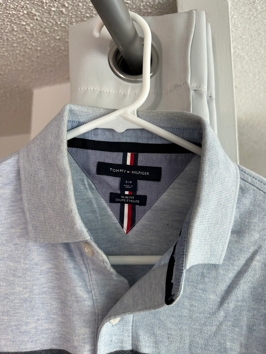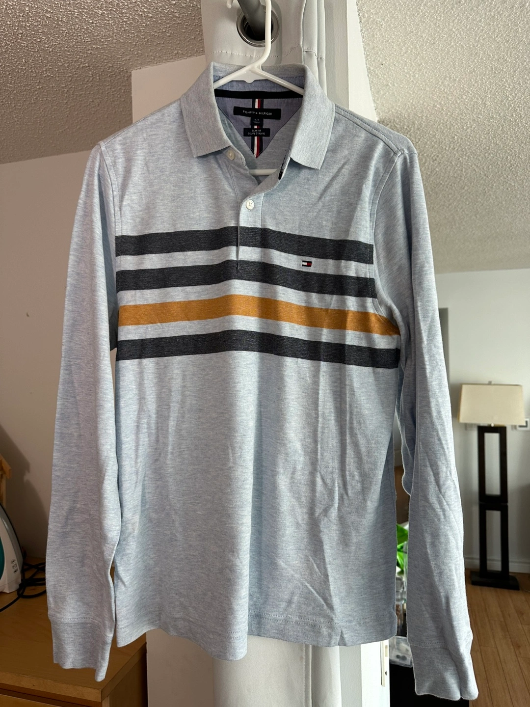Tommy Hilfiger long sleeve polo shirt in size small! It's a light blue colour with a horizontal stripe design across the chest. This shirt is in great condition and ready for a new home