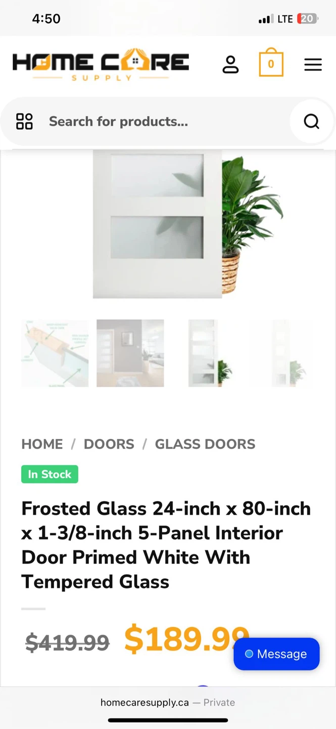 Selling a frosted glass 24-inch x 80-inch x 1-3/8-inch 5-Panel Interior Door Primed White with Tempered Glass from Home Care Supply! Originally priced at $419.99, it's now available at a great price