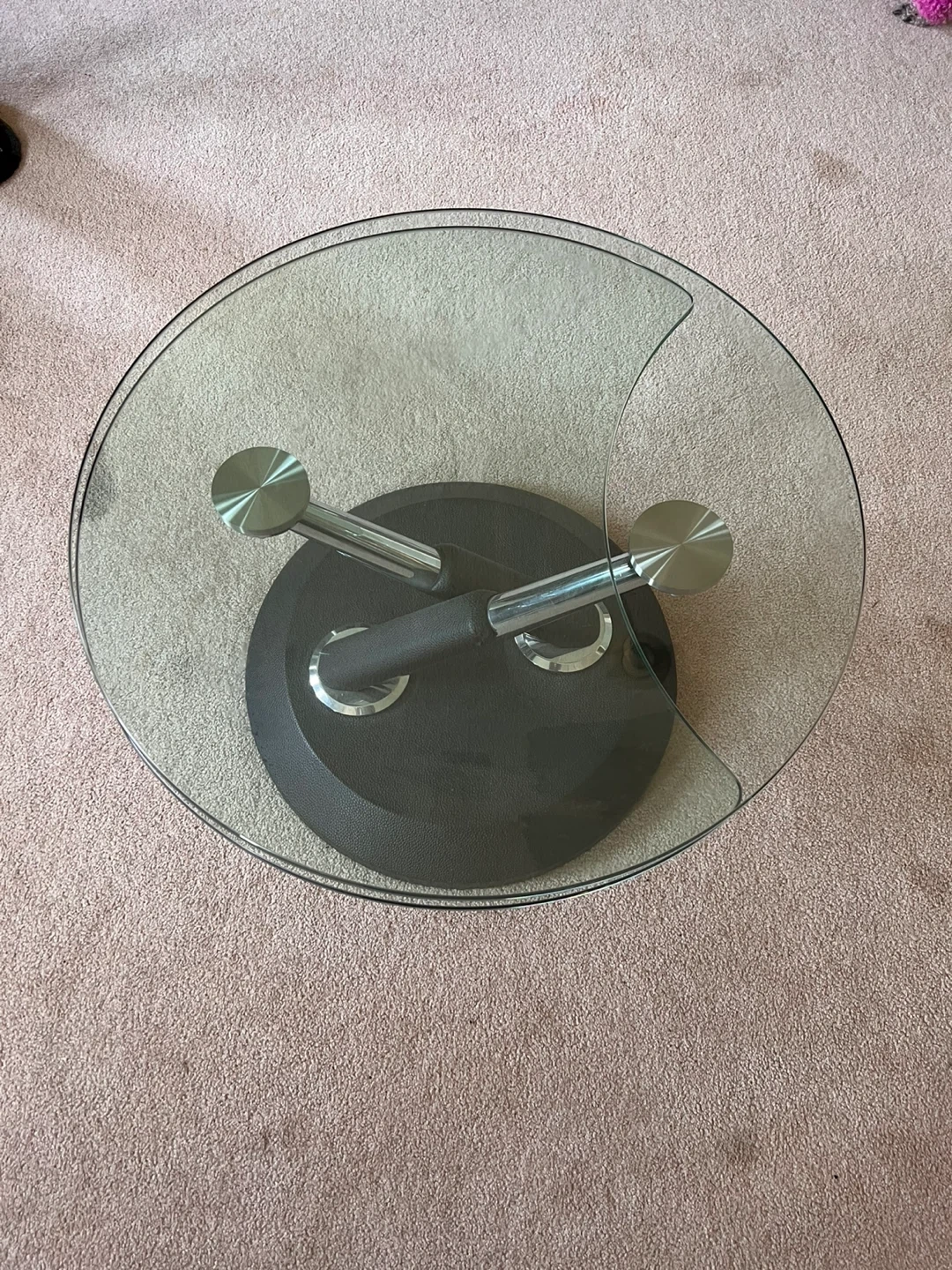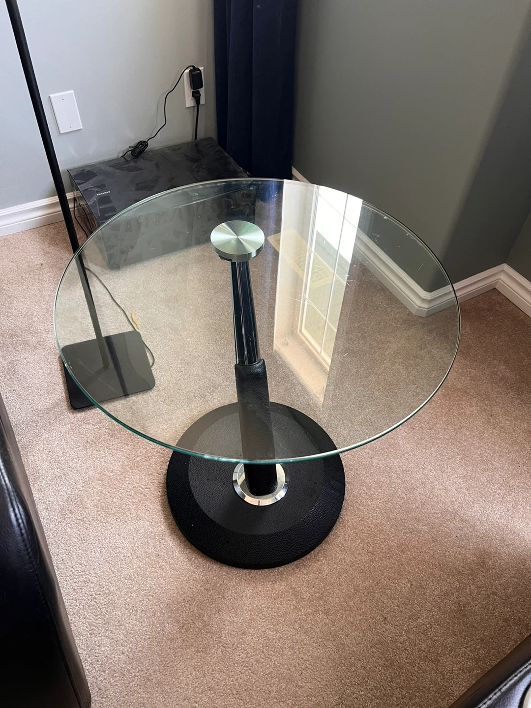 Selling a round glass top side table. The base is black. It's in great condition and would look lovely in any living room or bedroom no scratches smoke free home