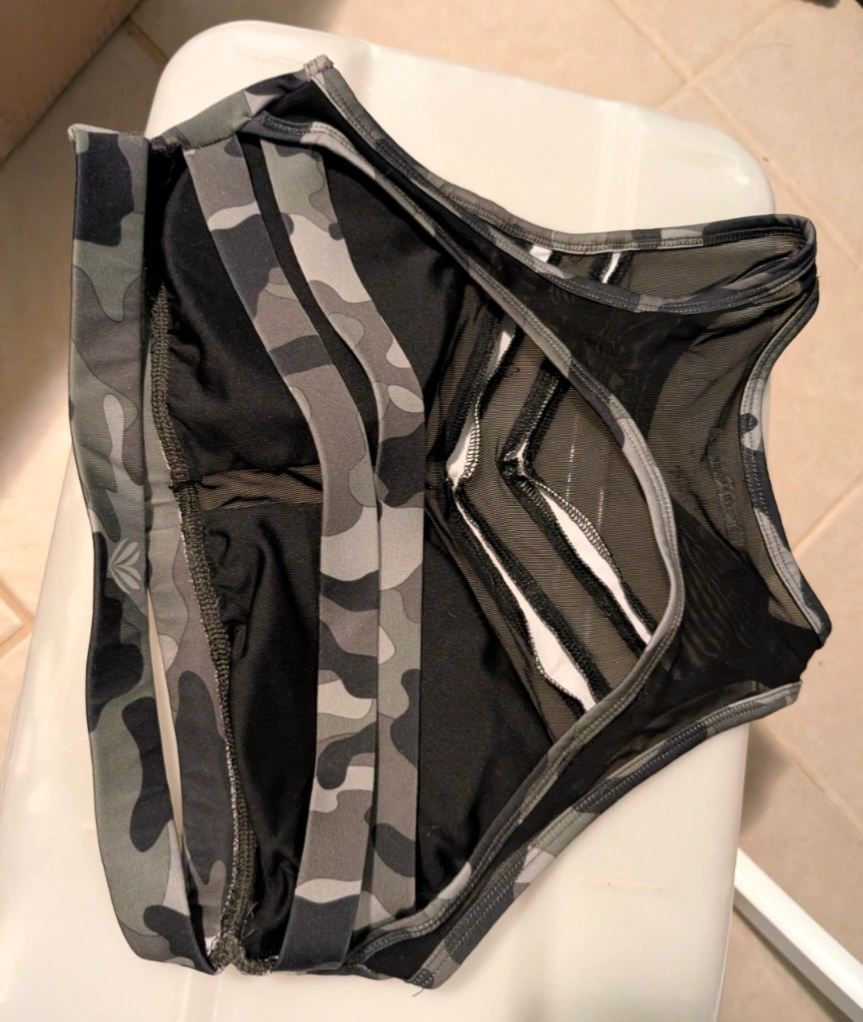 Medium size sport bra. Camouflage print with mesh detailing. Racerback style. Good for workouts. From home with dogs near Damen & Montrose