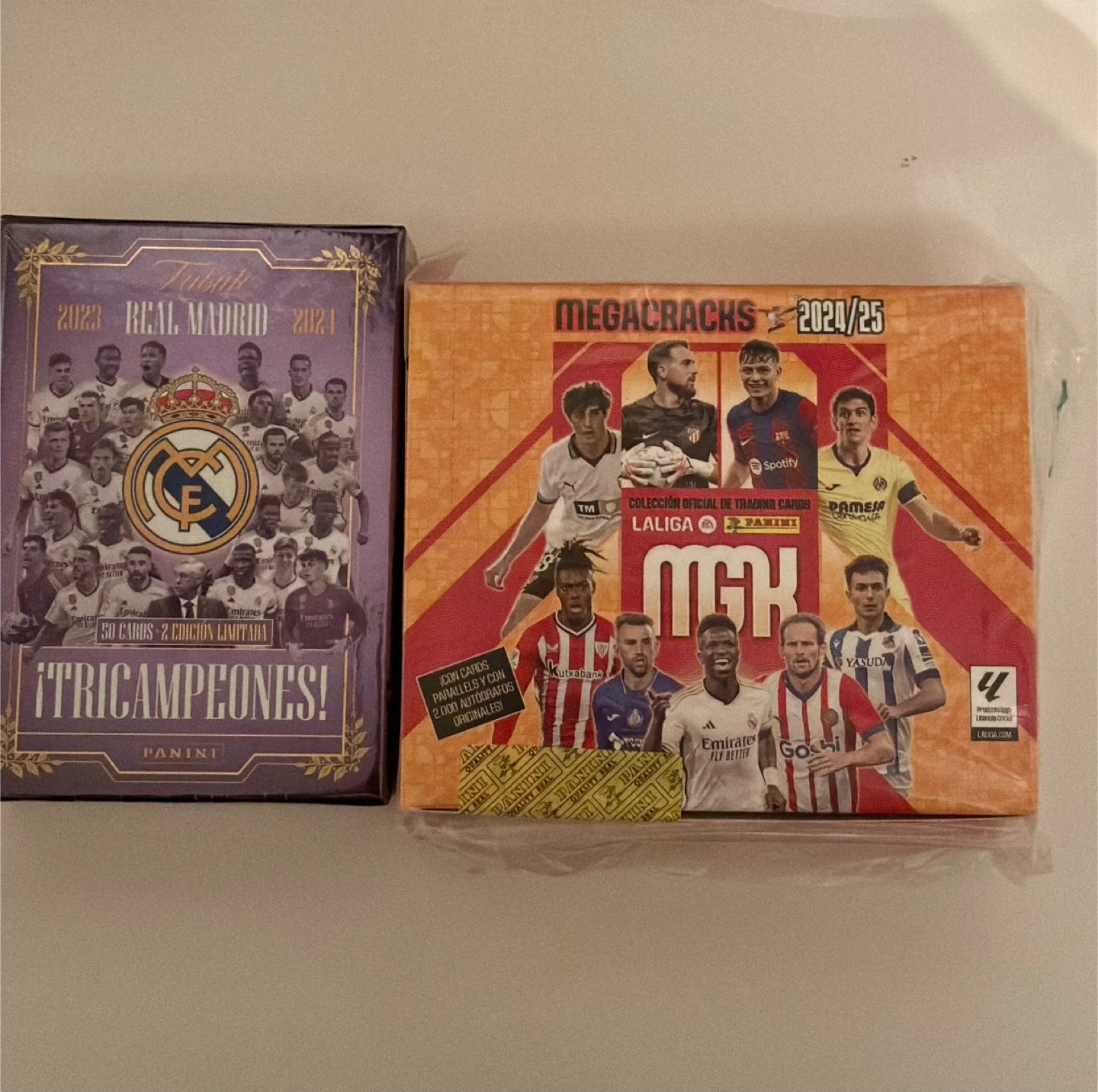 Selling two boxes of Panini trading cards! One is a Real Madrid box from 2023-2024, and the other is a Megacracks box from the 2024-2025 season. Both boxes are sealed and contain trading cards from La Liga.